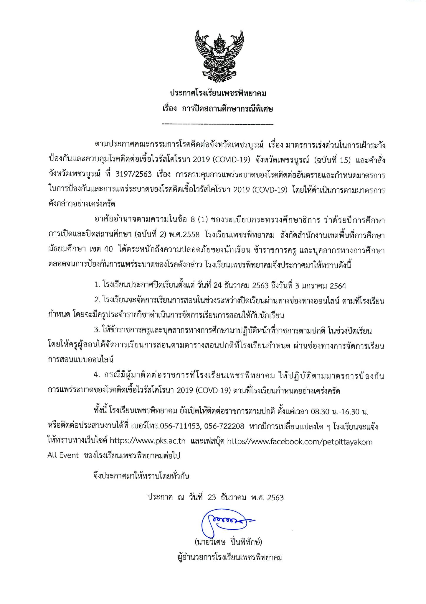 ประกาศโรงเรียนเพชรพิทยาคม เรื่อง การปิดสถานศึกษากรณีพิเศษ