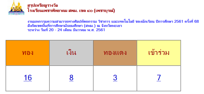 ดูรายละเอียดสรุปเหรียญรางวัลของโรงเรียนเพชรพิทยาคม ได้ที่ :: ลิงค์ประกาศ