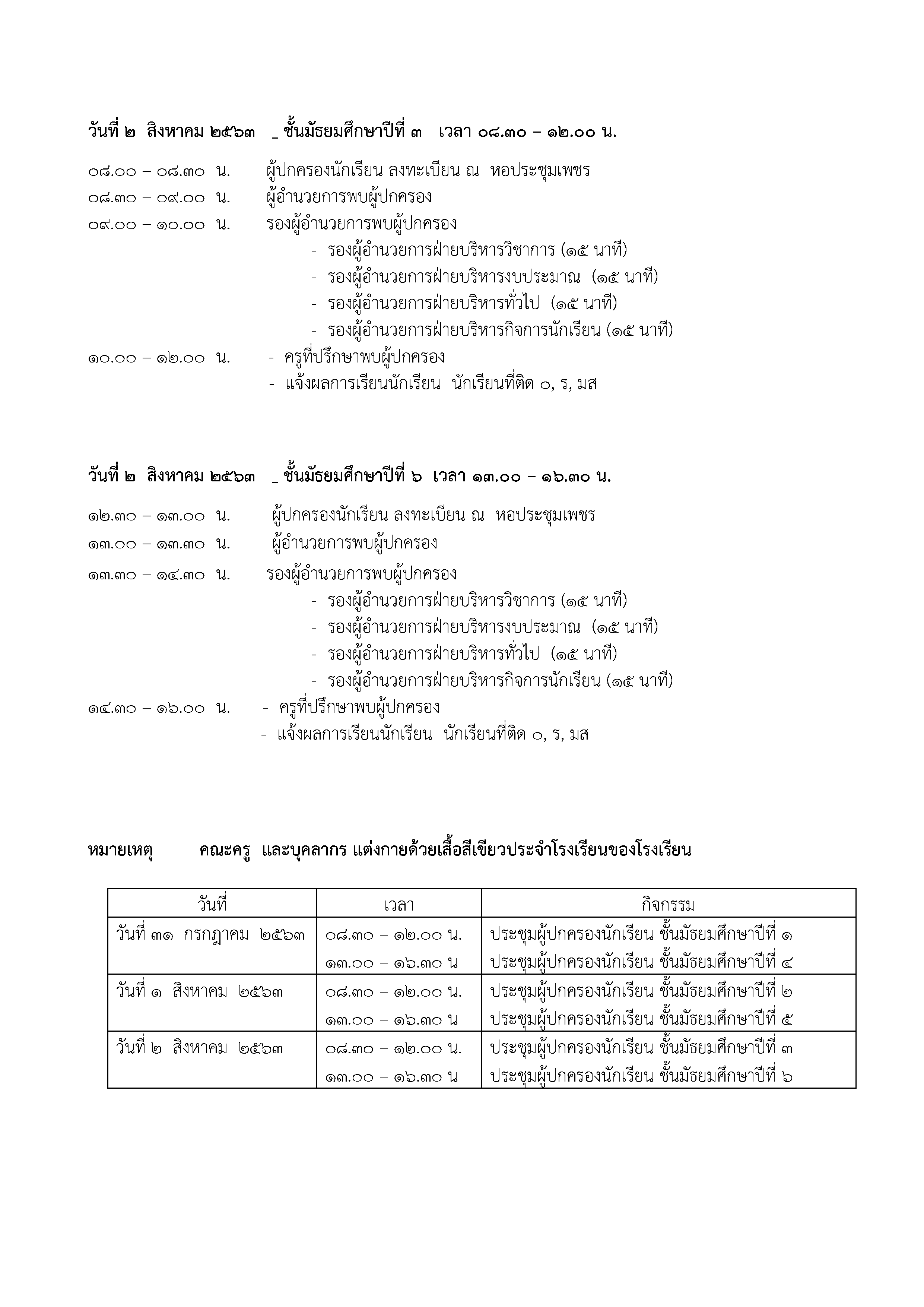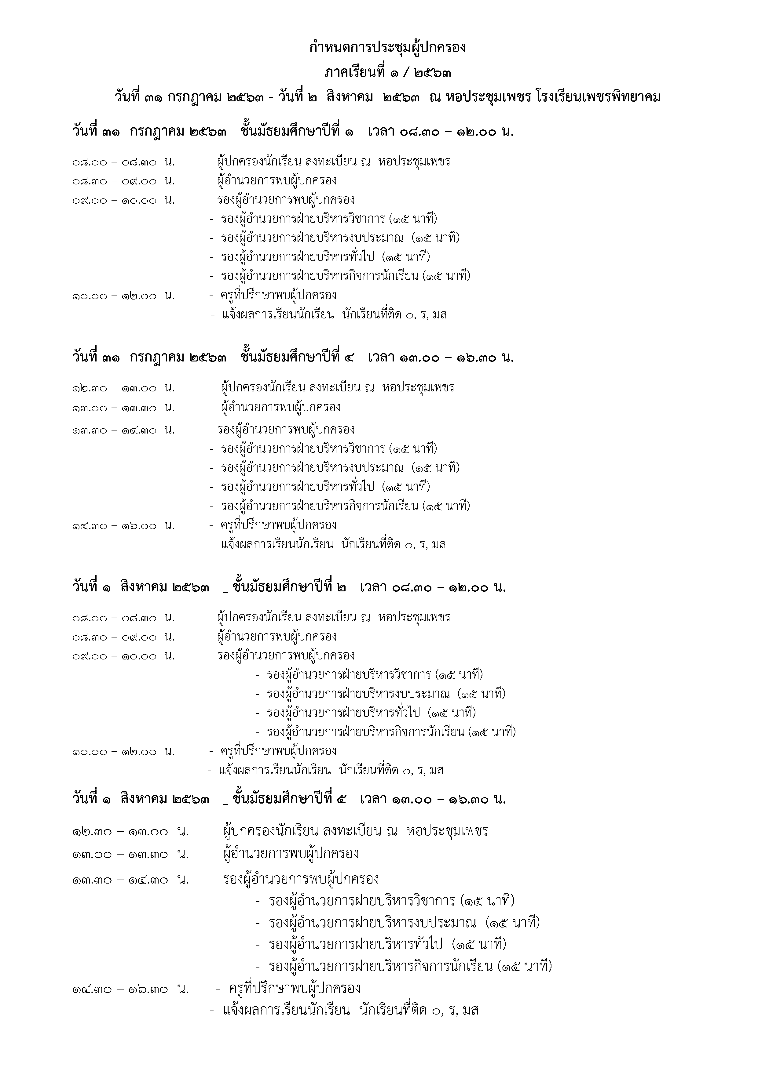 กำหนดการประชุมผู้ปกครอง ภาคเรียนที่ 1/2563 วันที่ 31 กรกฎาคม - 2 สิงหาคม 2563 ณ หอประชุมเพชร โรงเรียนเพชรพิทยาคม
