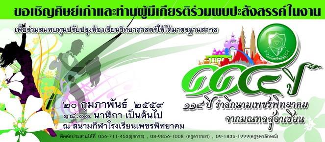 ขอเชิญศิษย์เก่าและท่านผู้มีเกียรติ ร่วมพบปะสังสรรค์ในงาน 114 ปี รำลึกนาม "เพชรพิทยาคม จากมณฑลสู่อาเซียน" เพื่อร่วมสมทบทุนปรับปรุงห้องเรียน วิทยาศาตร์ ให้ได้มาตรฐานสากล ในวันที่ 20 กุมภาพันธ์ 2559 เวลา 18.00 น. เป็นต้นไป ณสนามกีฬาโรงเรียนเพชรพิทยาคม สำรองที่นั่งได้ที่ โทร.056-711453
