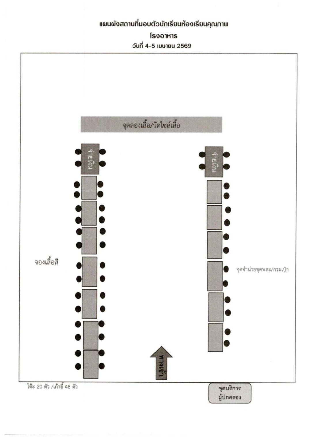 - จุดบริการลองเสื้อผ้า/ชุดพละ/กระเป๋า : ณ โรงอาหาร