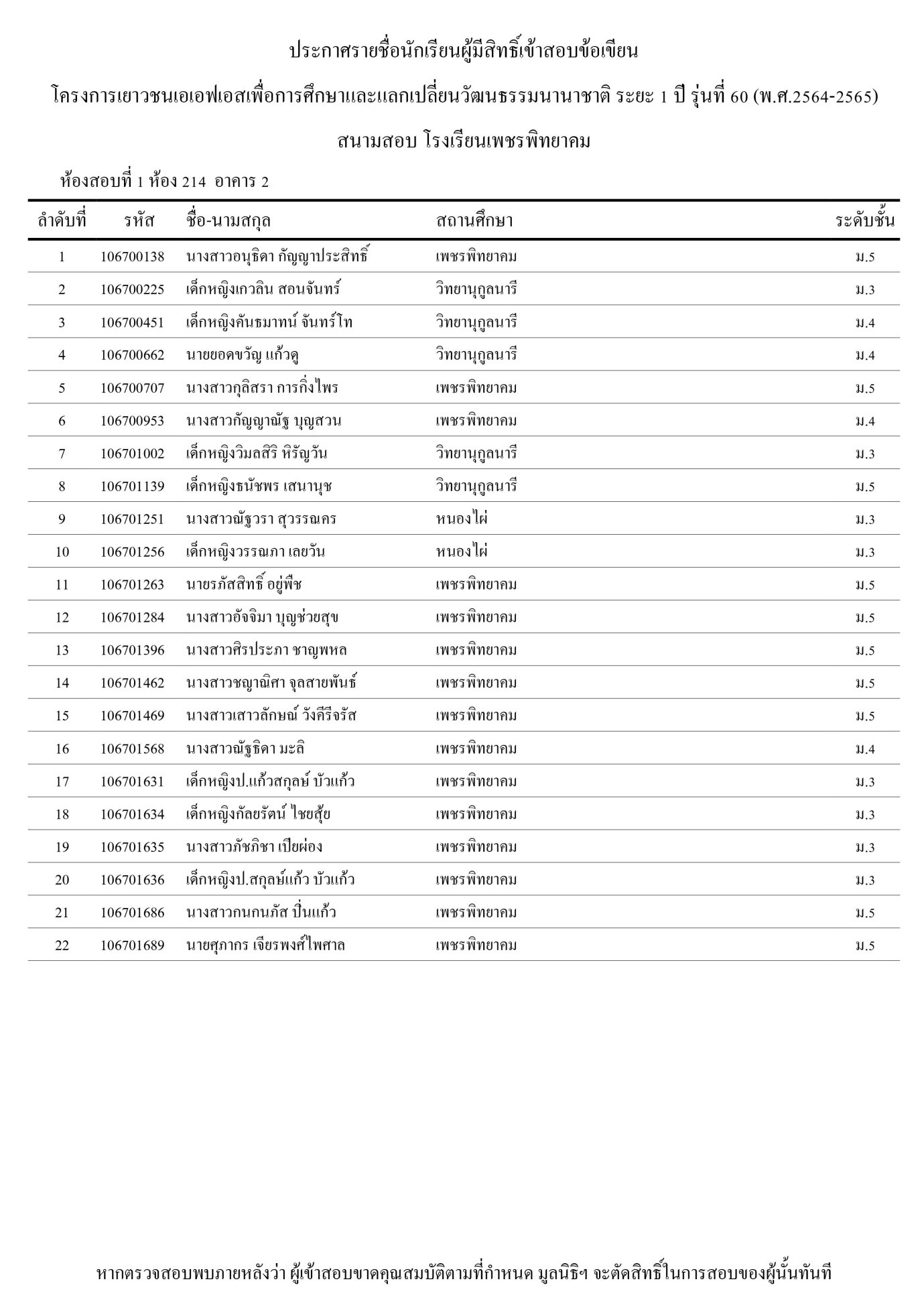 ประกาศรายชื่อนักเรียนผู้มีสิทธิ์เข้าสอบข้อเขียน AFS ระยะ 1 ปี รุ่นที่ 60 (พ.ศ. 2564 - 2565) เขตเพชรบูรณ์