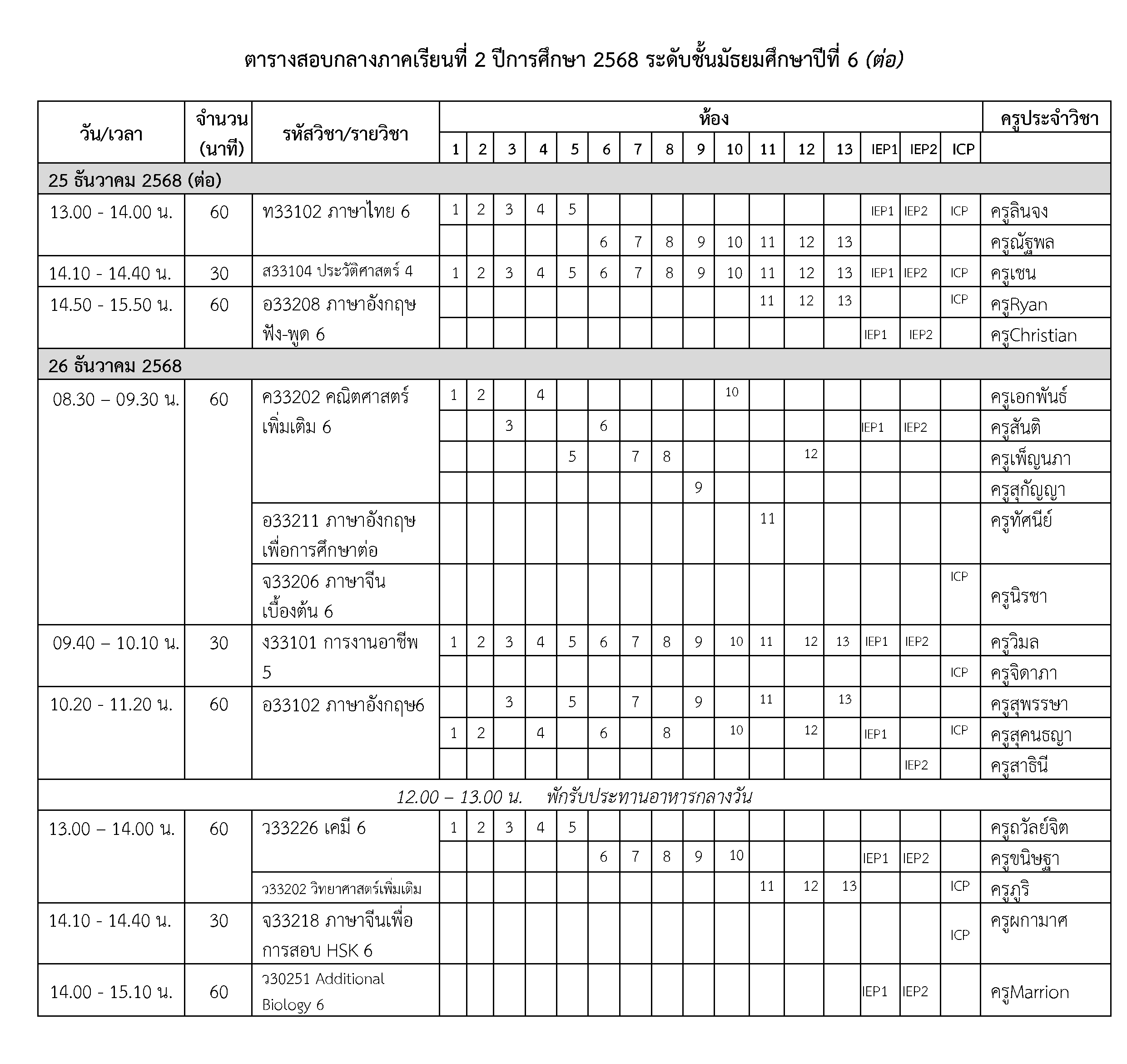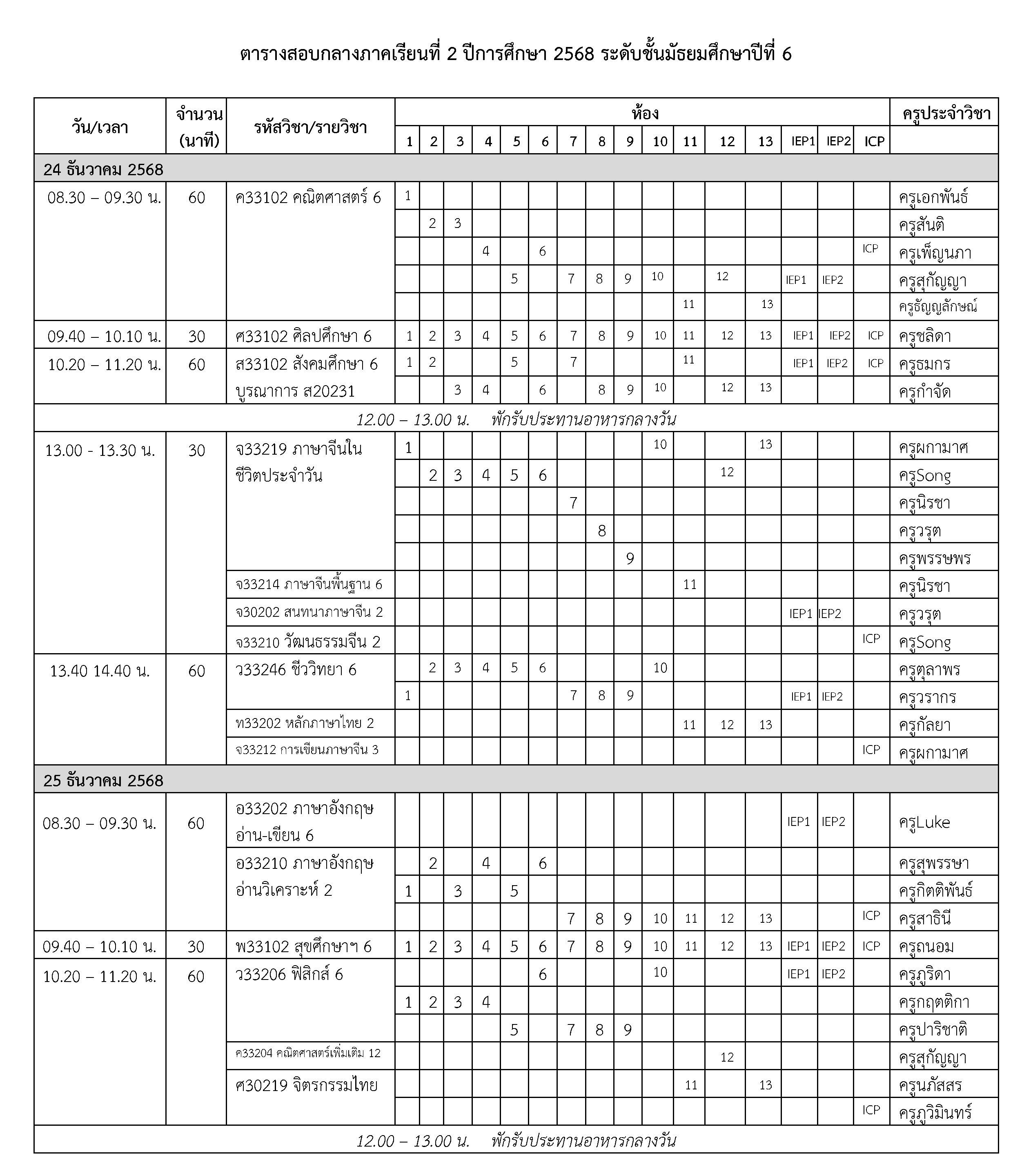 ตารางสอบกลางภาคเรียนที่ 2 ปีการศึกษา 2568 ระดับชั้น ม.6 ระหว่างวันที่ 24-26 ธันวาคม 2568