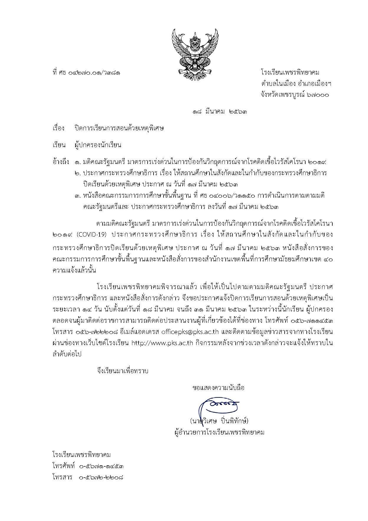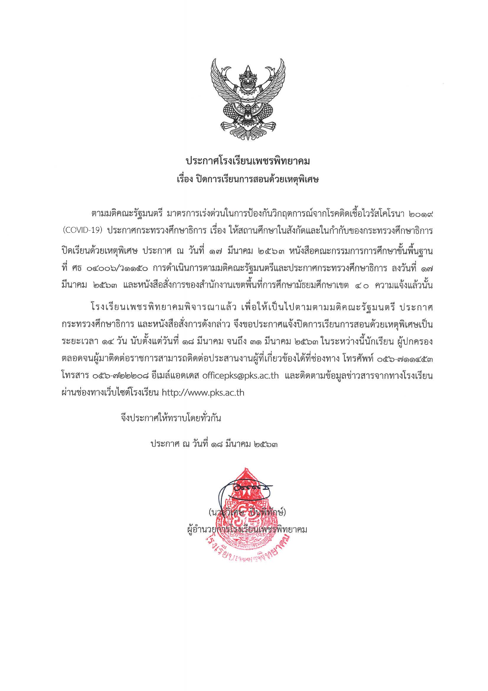 โรงเรียนเพชรพิทยาคมพิจารณาแล้ว เพื่อให้เป็นไปตามตามมติคณะรัฐมนตรี ประกาศกระทรวงศึกษาธิการ และหนังสือสั่งการดังกล่าว จึงขอประกาศแจ้งปิดการเรียนการสอนด้วยเหตุพิเศษเป็นระยะเวลา 14 วัน นับตั้งแต่วันที่ 18 มีนาคม จนถึง 31 มีนาคม 2563 ในระหว่างนี้นักเรียน ผู้ปกครอง ตลอดจนผู้มาติดต่อราชการสามารถติดต่อประสานงานผู้ที่เกี่ยวข้องได้ที่ช่องทาง โทรศัพท์ 056-711453 โทรสาร 056-722208 อีเมล์แอดเดรส officepks@pks.ac.th และติดตามข้อมูลข่าวสารจากทางโรงเรียน ผ่านช่องทางเว็บไซต์โรงเรียน http://www.pks.ac.th กิจกรรมหลังจากช่วงเวลาดังกล่าวจะแจ้งให้ทราบใน ลำดับต่อไป