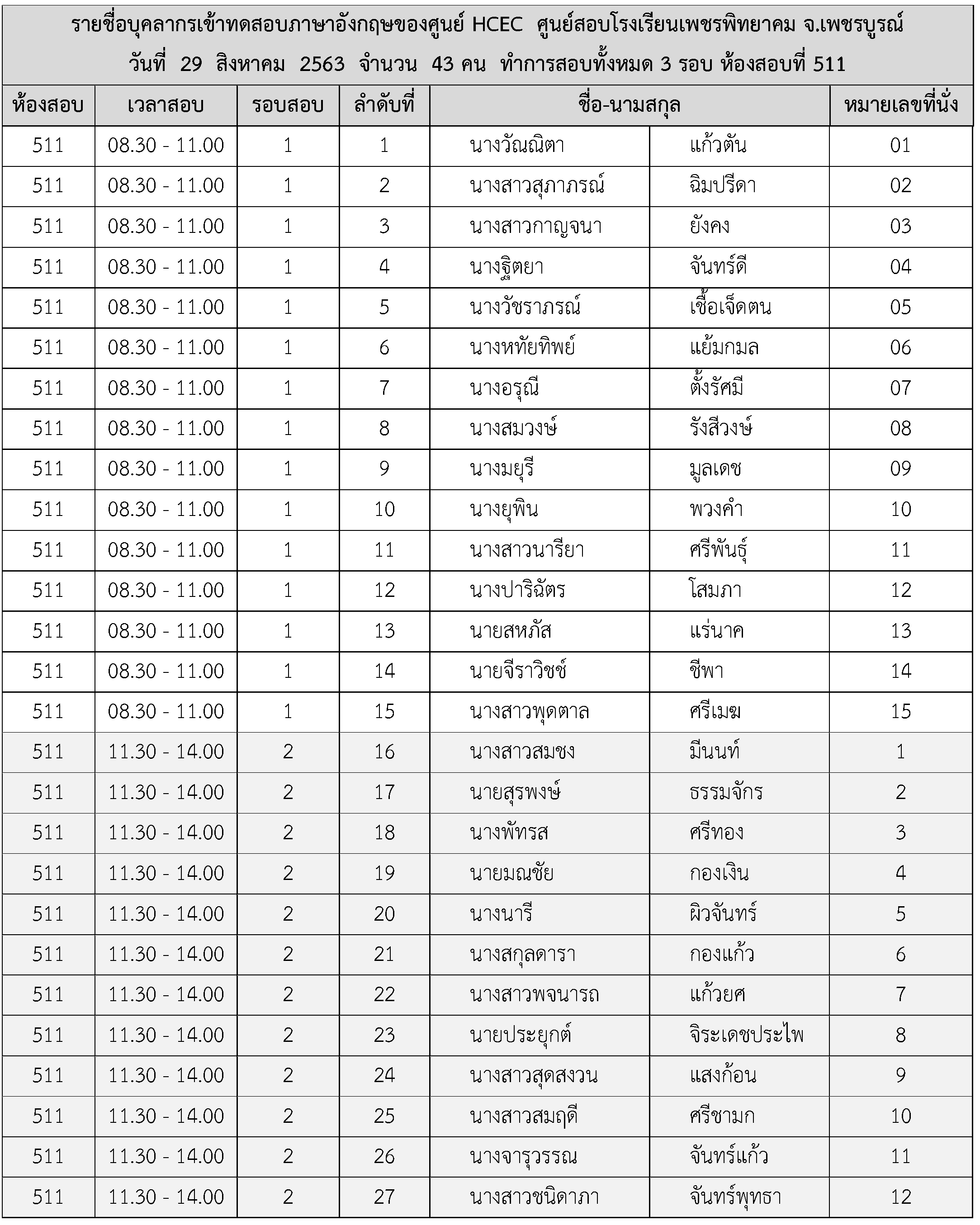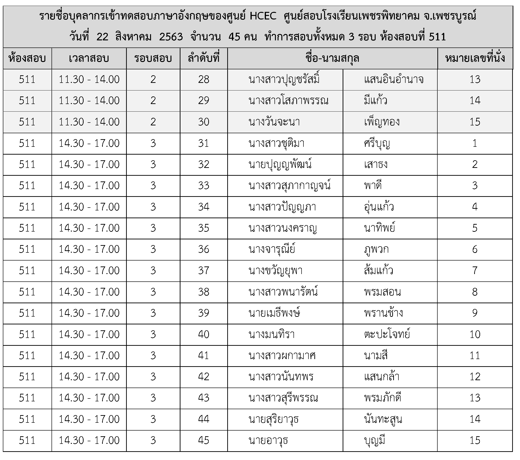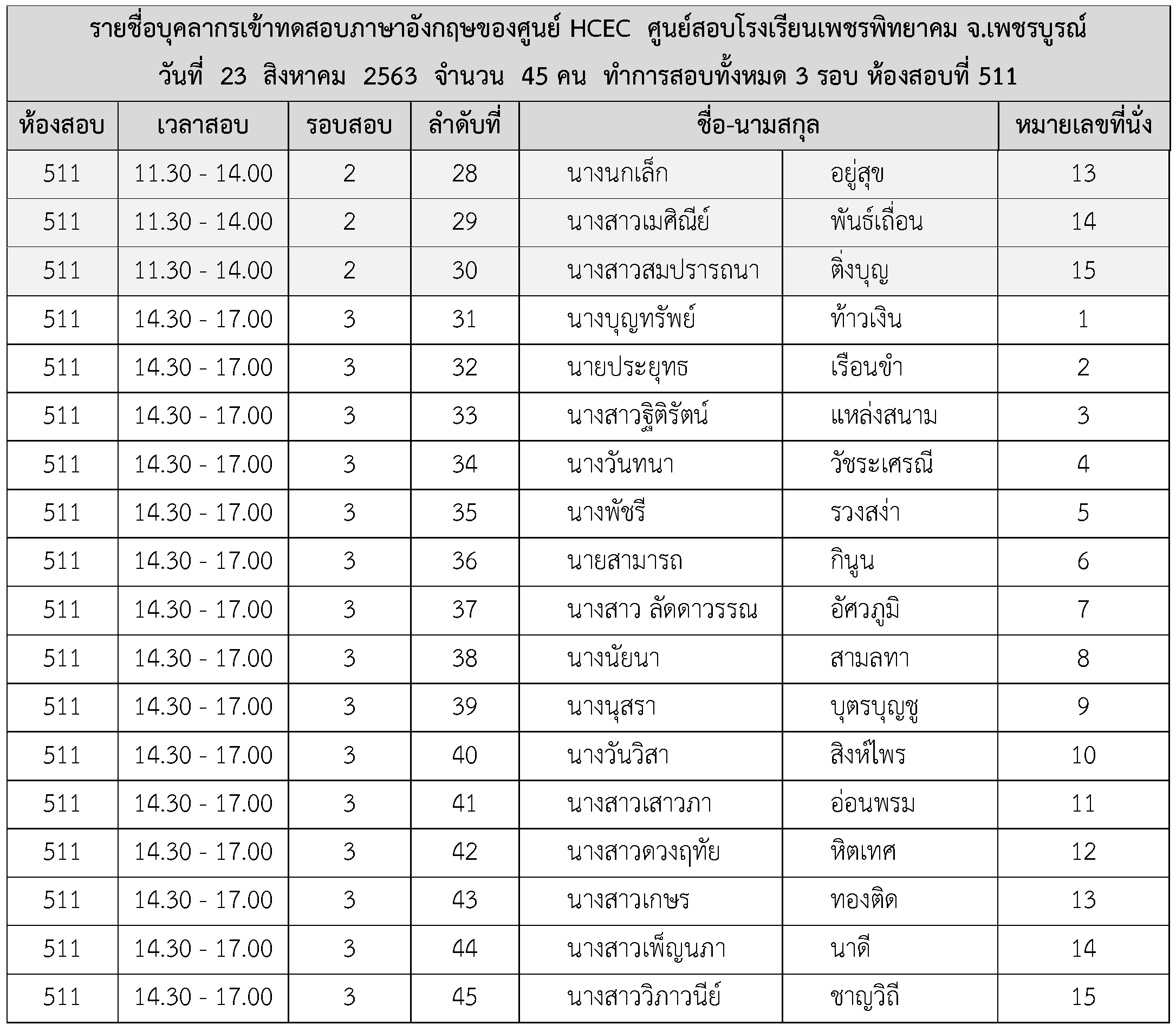 รายชื่อบุคลากรเข้าทดสอบภาษาอังกฤษของศูนย์ HCEC ศูนย์สอบโรงเรียนเพชรพิทยาคม จ.เพชรบูรณ์