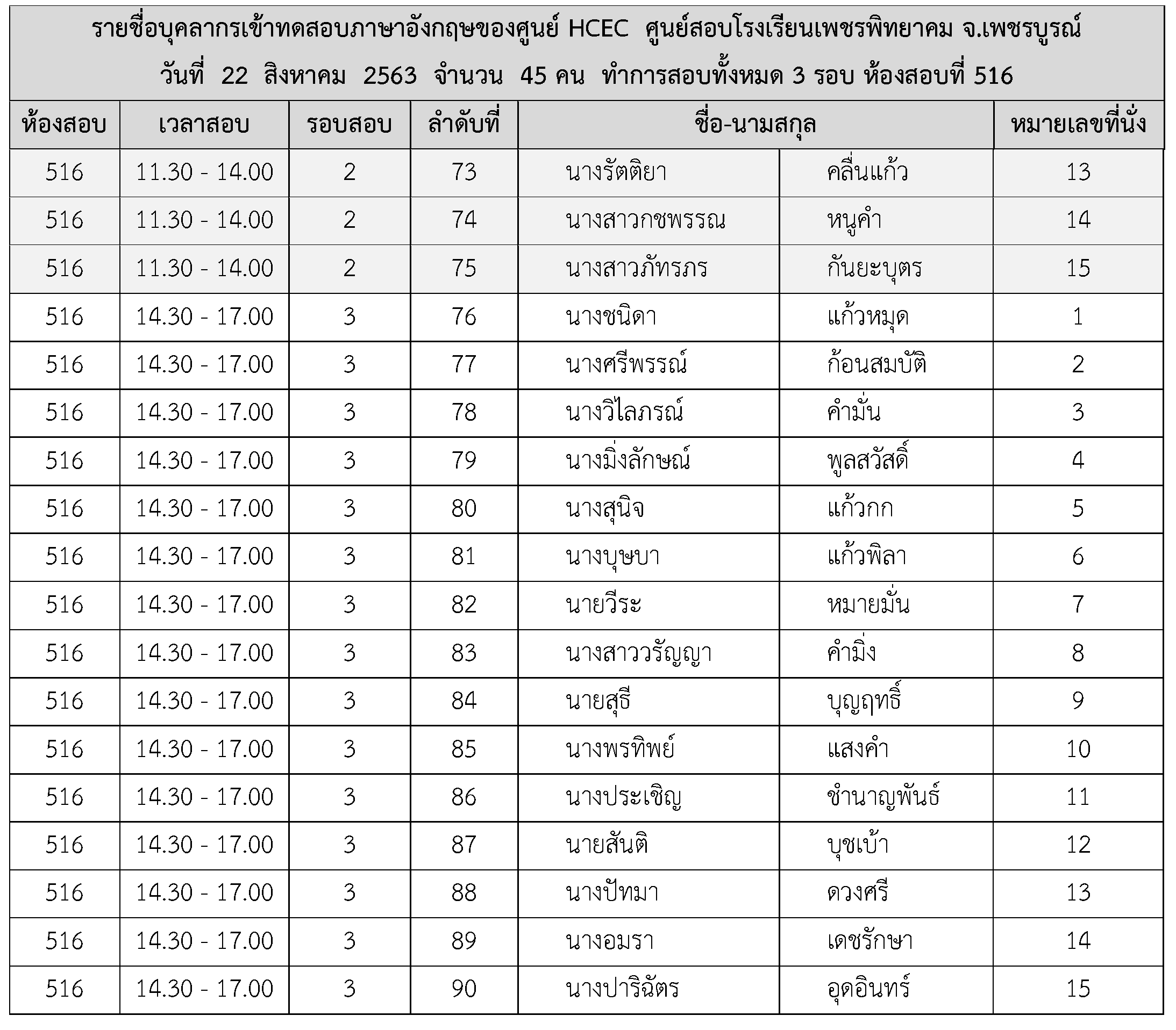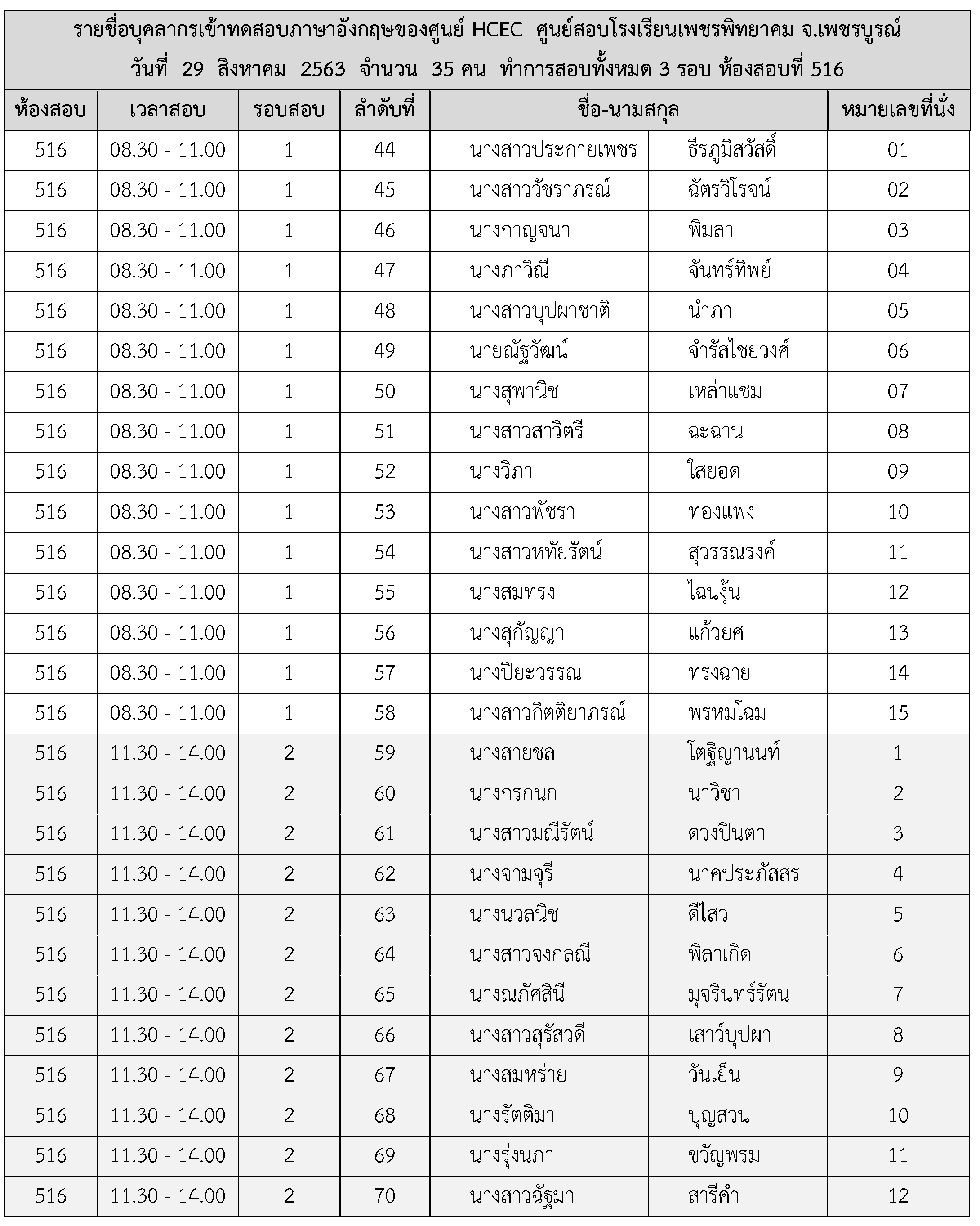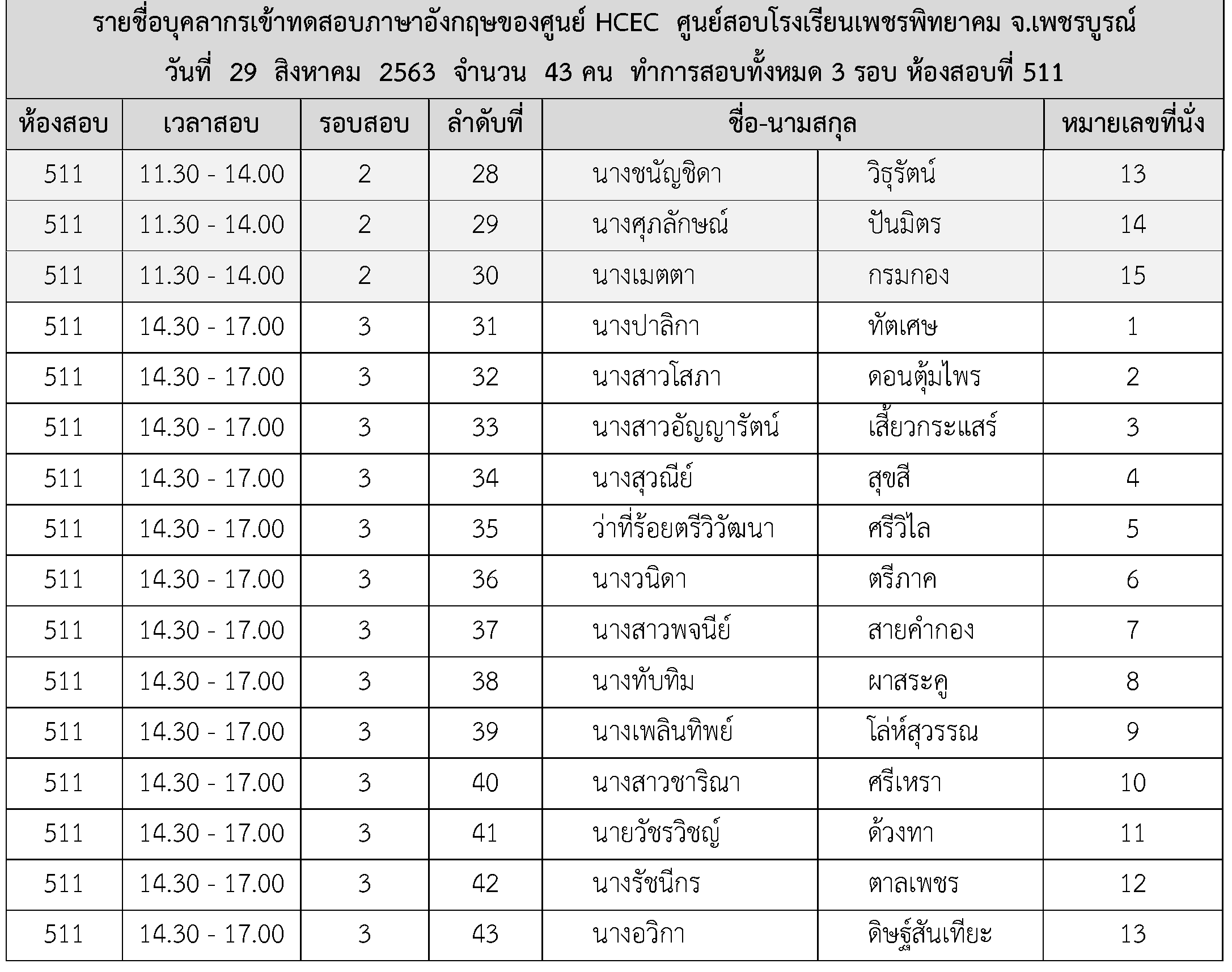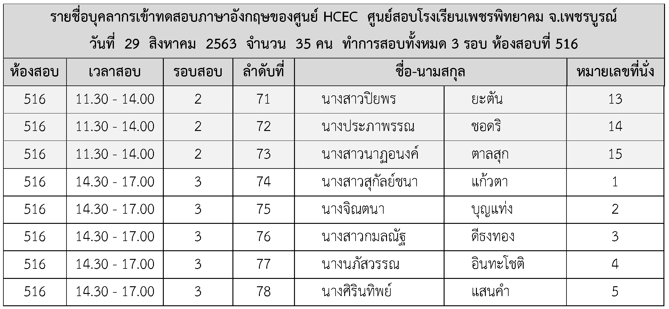 รายชื่อบุคลากรเข้าทดสอบภาษาอังกฤษของศูนย์ HCEC ศูนย์สอบโรงเรียนเพชรพิทยาคม จ.เพชรบูรณ์