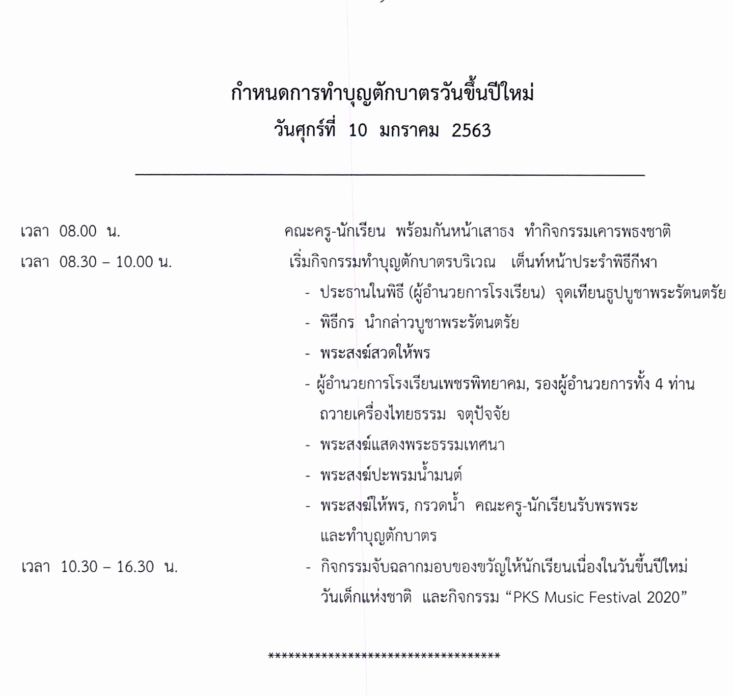 โรงเรียนเพชรพิทยาคม จัดกิจกรรมทำบุญตักบาตร เนื่องในวันขึ้นปีใหม่ ประจำปี 2563 และกิจกรรม PKS Music Festival 2020