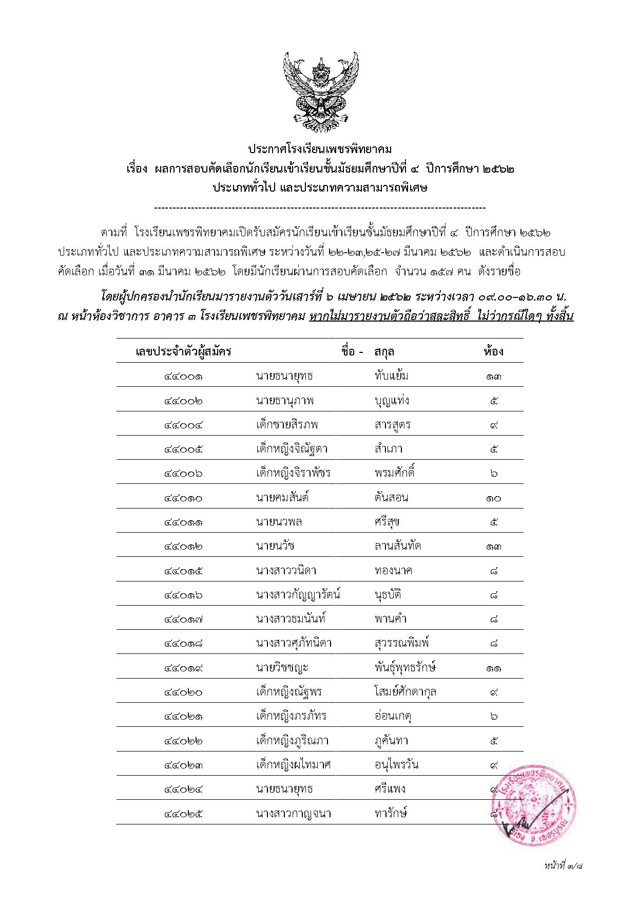 ตามที่ โรงเรียนเพชรพิทยาคมเปิดรับสมัครนักเรียนเข้าเรียนชั้นมัธยมศึกษาปีที่ 4 ปีการศึกษา 2562 ประเภททั่วไป และประเภทความสามารถพิเศษ ระหว่างวันที่ 22-23,25-27 มีนาคม 2562 และดำเนินการสอบคัดเลือก เมื่อวันที่ 31 มีนาคม 2562 โดยมีนักเรียนผ่านการสอบคัดเลือก จำนวน 157 คน ดังรายชื่อ