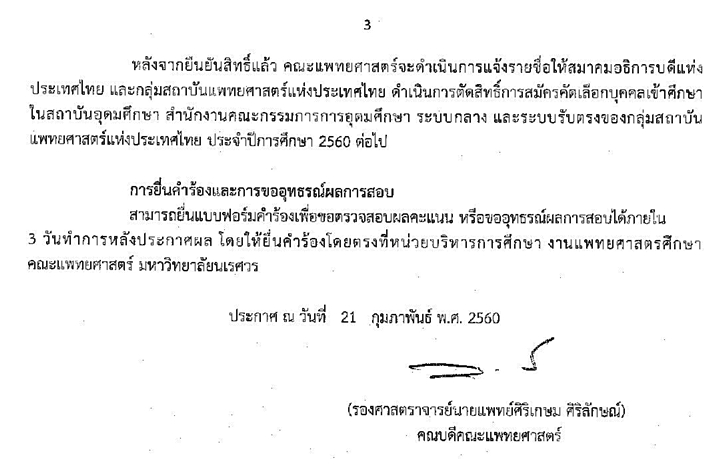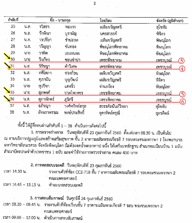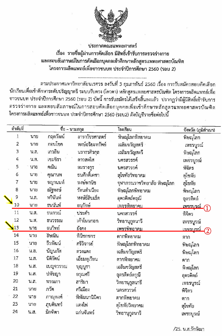 ตามประกาศมหาวิทยาลัยนเรศวร ลงวันที่ 3 กุมภาพันธ์ 2560 เรื่อง การรับสมัครสอบคัดเลือกนักเรียนเพื่อเข้าศึกษาระดับปริญญาตรี ระบบรับตรง (โควตา) หลักสูตรแพทยศาสตรบัณฑิต โครงการผลิตแพทย์เพื่อชาวชนบท ประจำปีการศึกษา 2560 (รอบ 2) บัดนี้ การรับสมัครได้เสร็จสิ้นลงแล้ว ปรากฏว่ามีผู้มีสิทธิ์เข้ารับการตรวจร่างกาย และสอบสัมภาษณ์ในการสอบคัดเลือกบุคคลเพื่อเข้าศึกษาหลักสูตรแพทยศาสตรบัณฑิต