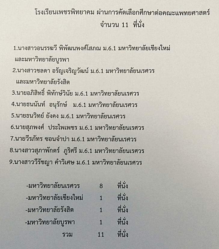 ขอแสดงความยินดี! 6 นักเรียน โรงเรียนเพชรพิทยาคม ผ่านการคัดเลือกรอบ2 หลักสูตรแพทยศาสตรบัณฑิต โครงการผลิตแพทย์เพื่อชาวชนบท ปีการศึกษา 2560