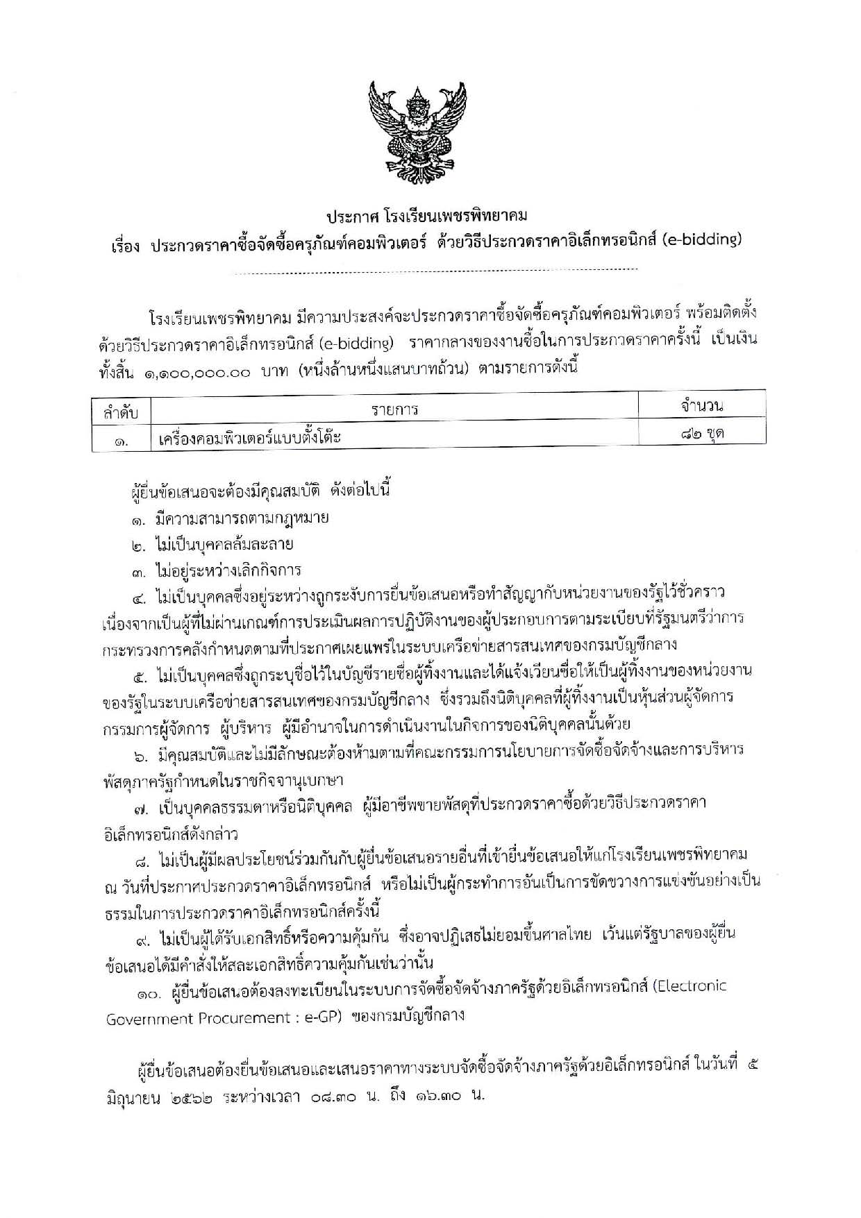 โรงเรียนเพชรพิทยาคม ประกาศประกวดราคาซื้อจัดซื้อครุภัณฑ์คอมพิวเตอร์ ด้วยวิธีประกวดราคาอิเล็กทรอนิกส์ (e-bidding)