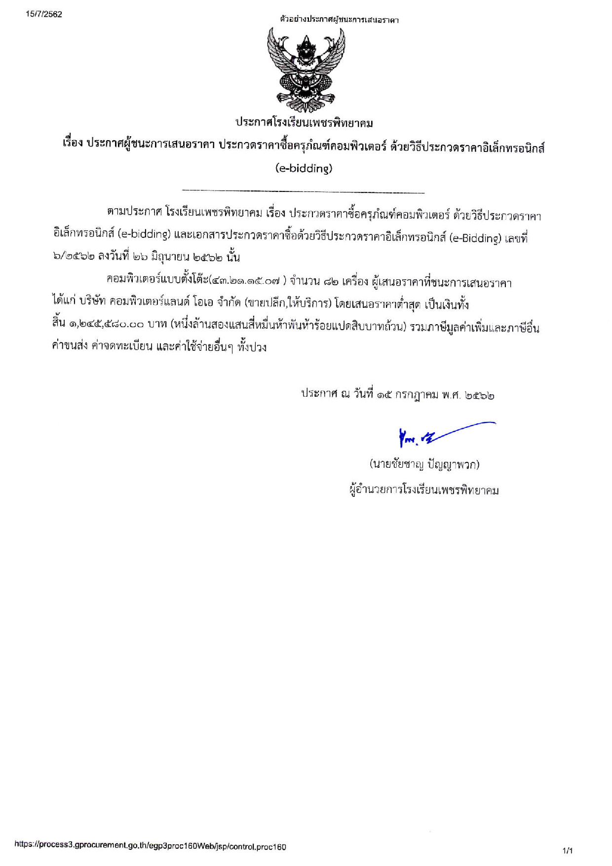 เรื่อง ประกาศผู้ชนะการเสนอราคา ประกวดราคาซื้อครุภัณฑ์คอมพิวเตอร์ ด้วยวิธีประกวดราคาอิเล็กทรอนิกส์ (e-bidding)
