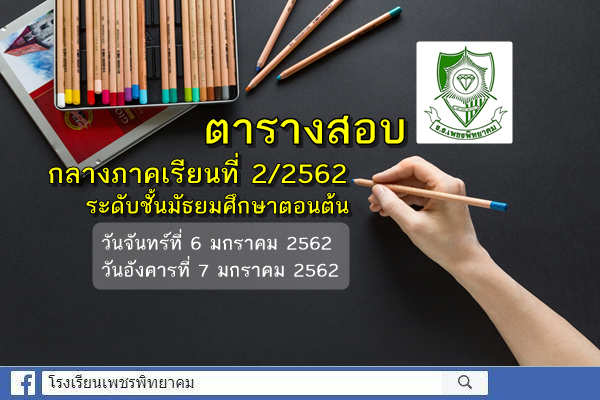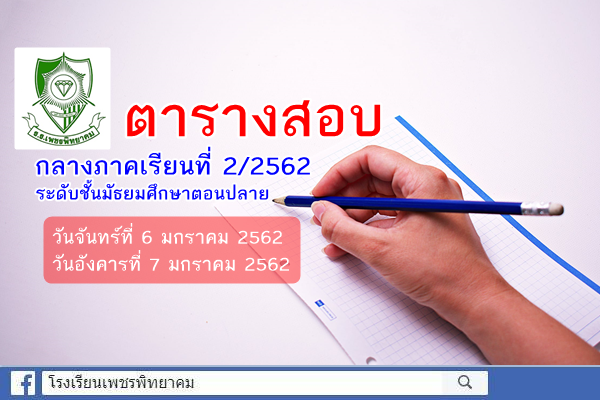 โรงเรียนเพชรพิทยาคม กำหนดจัดสอบกลางภาคเรียนที่ 2 ปีการศึกษา 2562 ในวันจันทร์ที่ 6 - วันอังคารที่ 7 เดือนมกราคม 2562