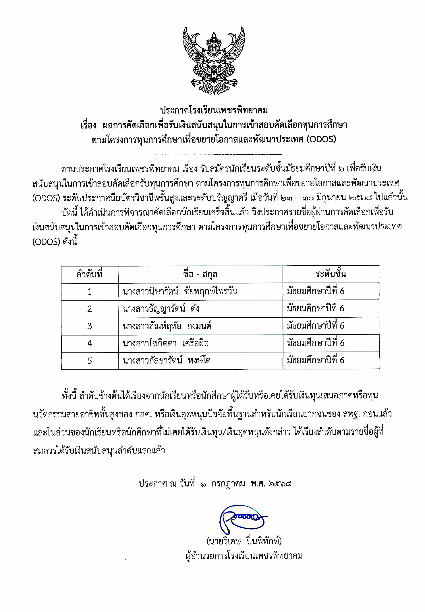 ประกาศโรงเรียนเพชรพิทยาคม เรื่อง ผลการคัดเลือกเพื่อรับเงินสนับสนุนในการเข้าสอบคัดเลือกทุนการศึกษา ตามโครงการทุนการศึกษาเพื่อขยายโอกาสและพัฒนาประเทศ (ODOS)