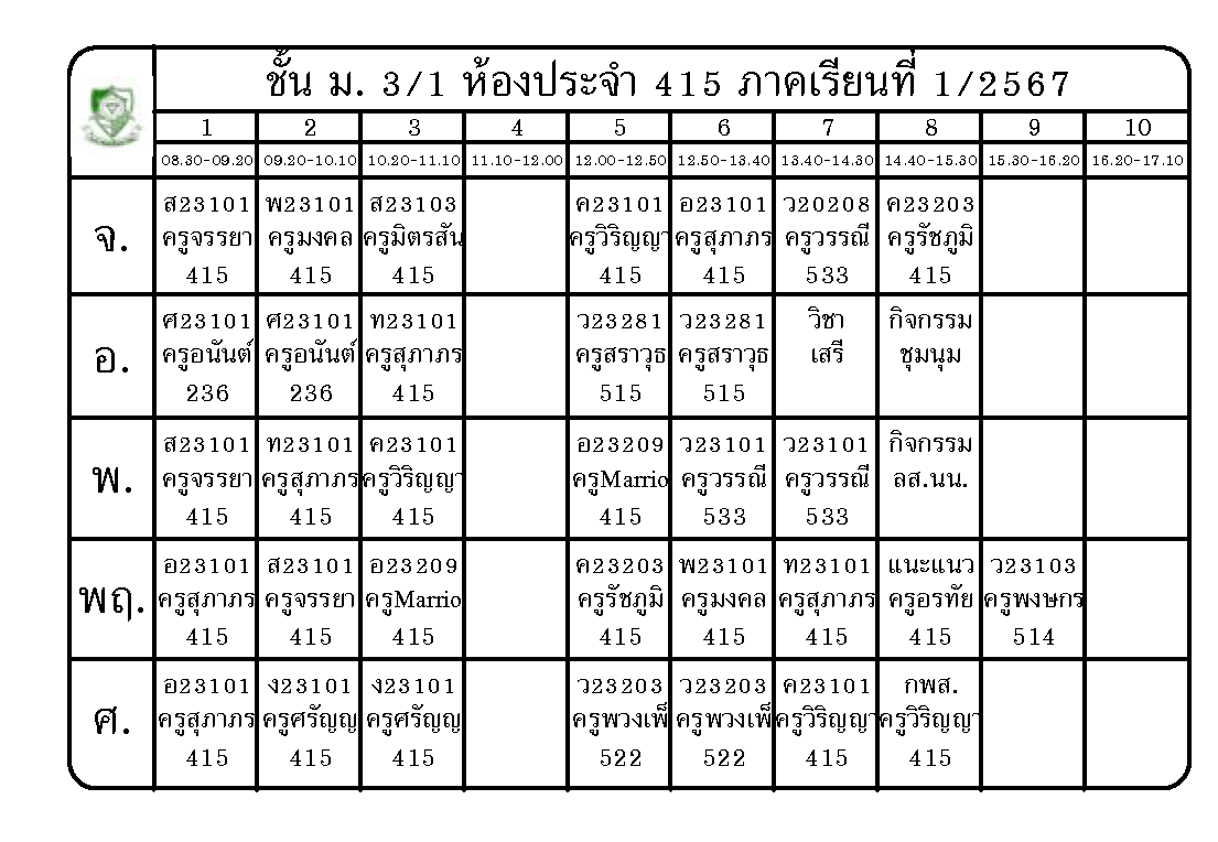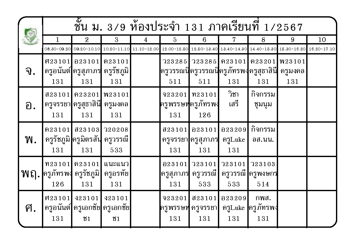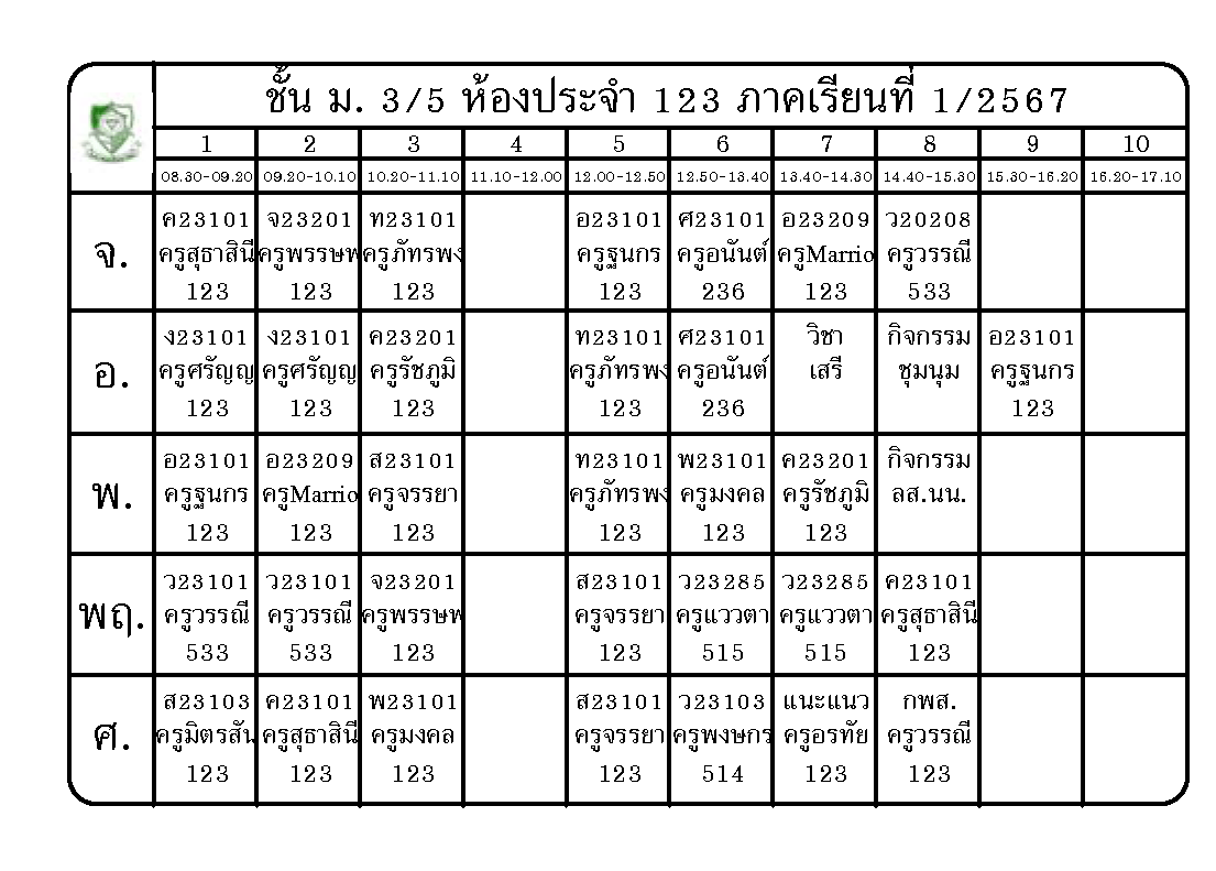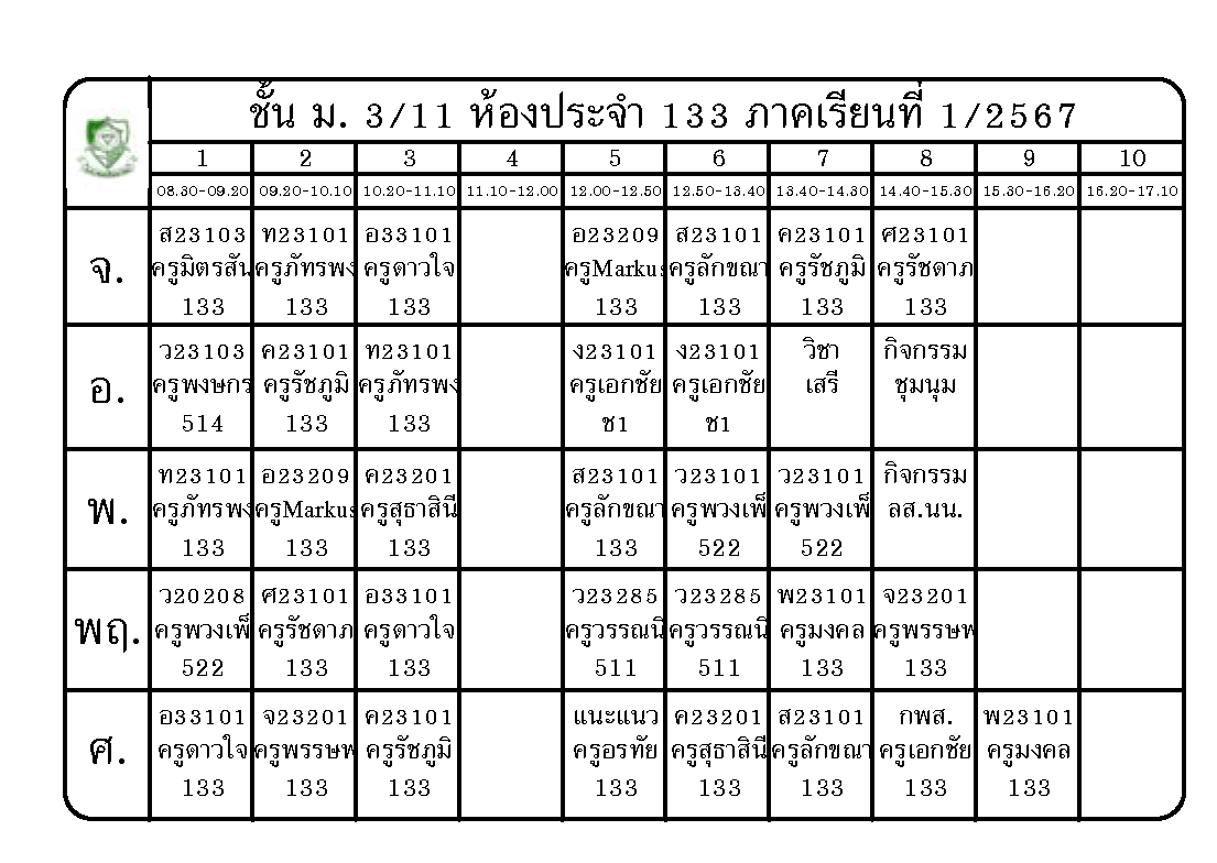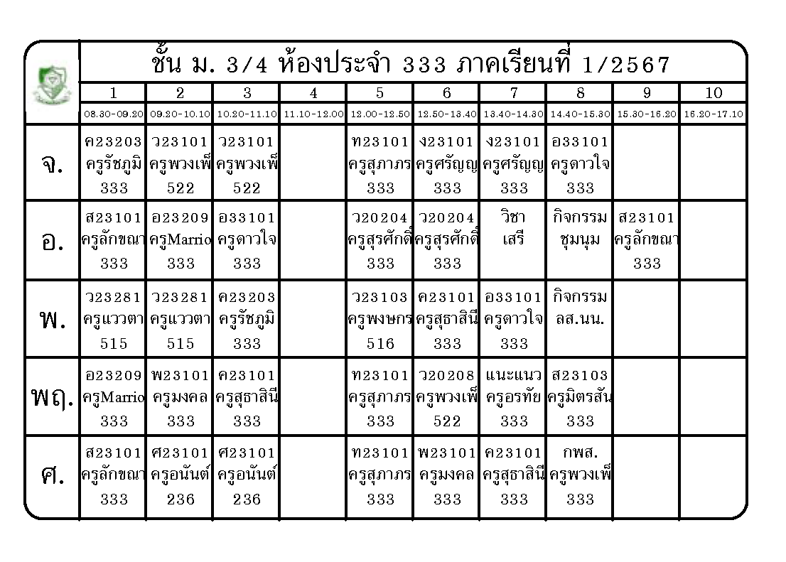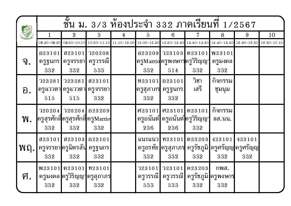 ตารางเรียน นักเรียนชั้นมัธยมศึกษาปีที่ 3 ภาคเรียนที่ 1 ปีการศึกษา 2567