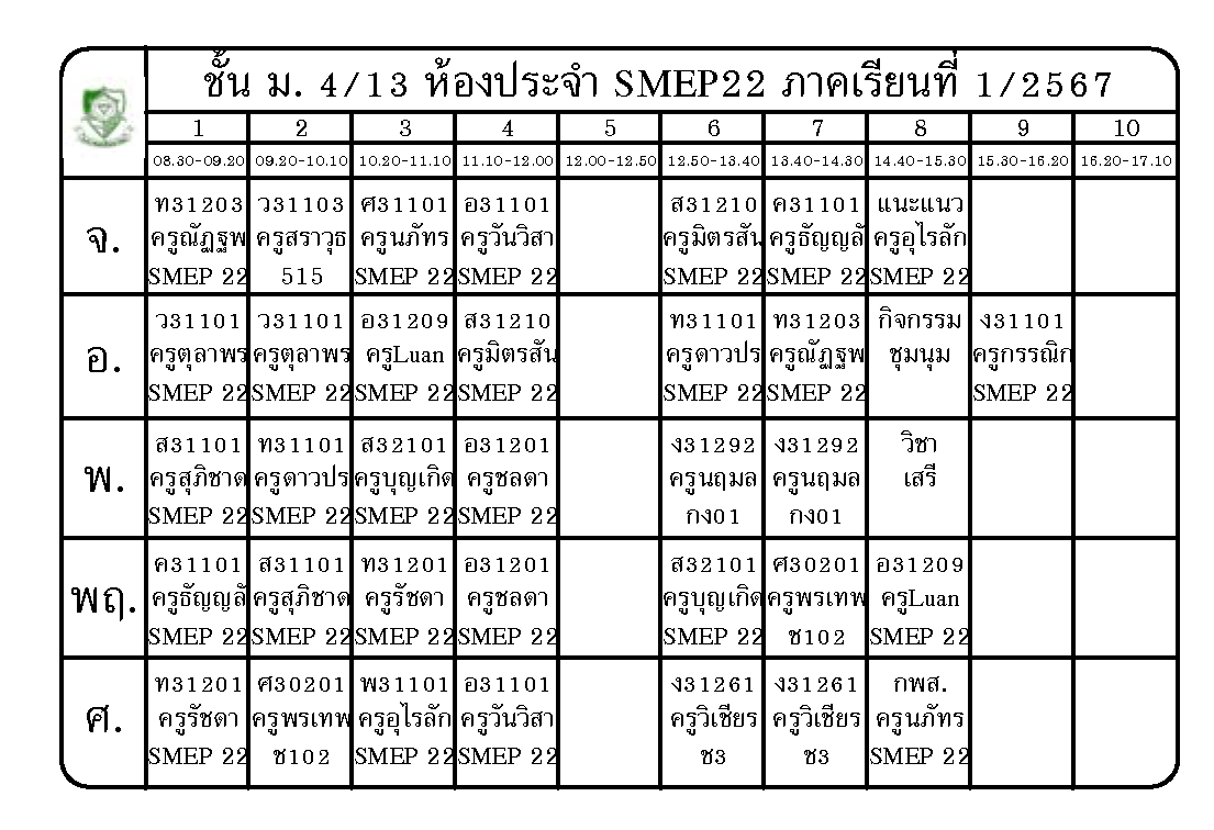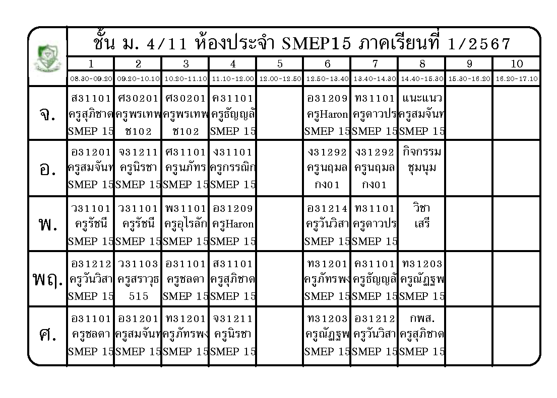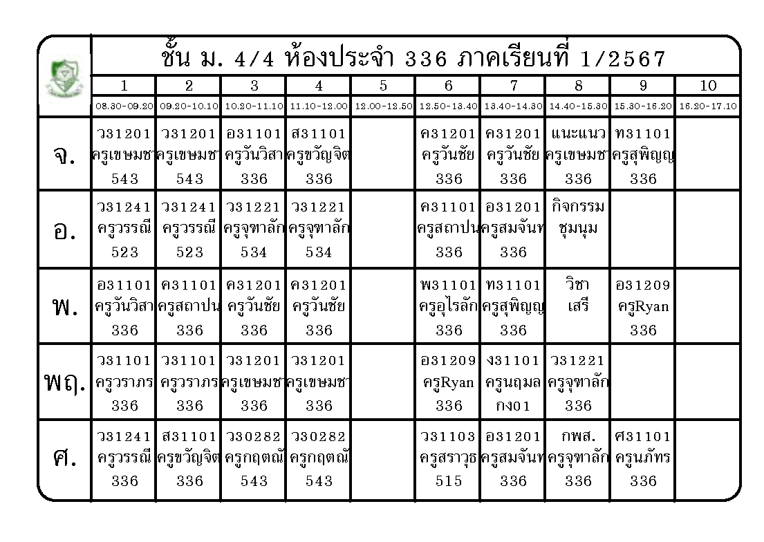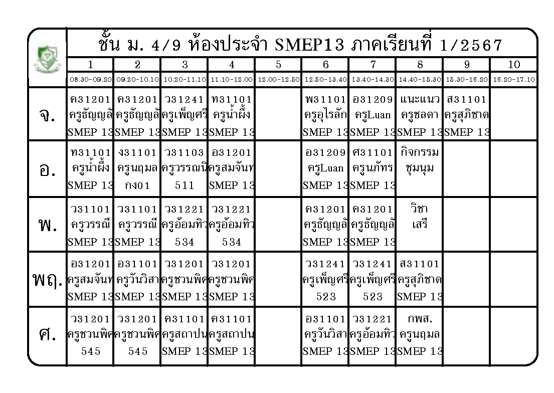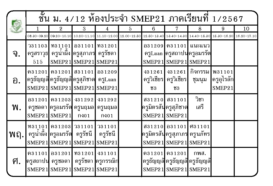 ตารางเรียน นักเรียนชั้นมัธยมศึกษาปีที่ 4 ภาคเรียนที่ 1 ปีการศึกษา 2567
