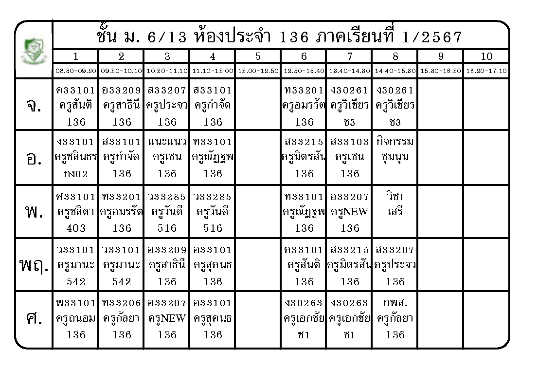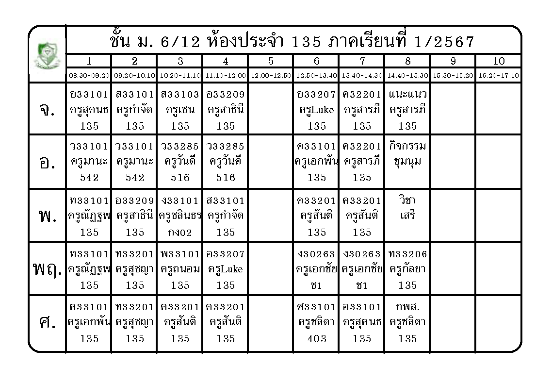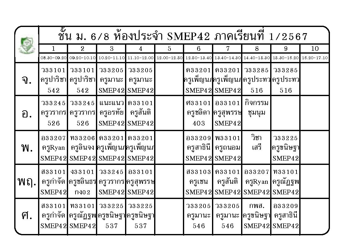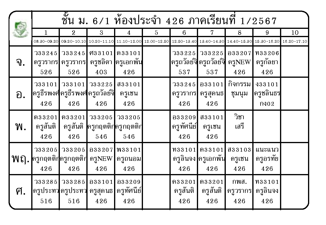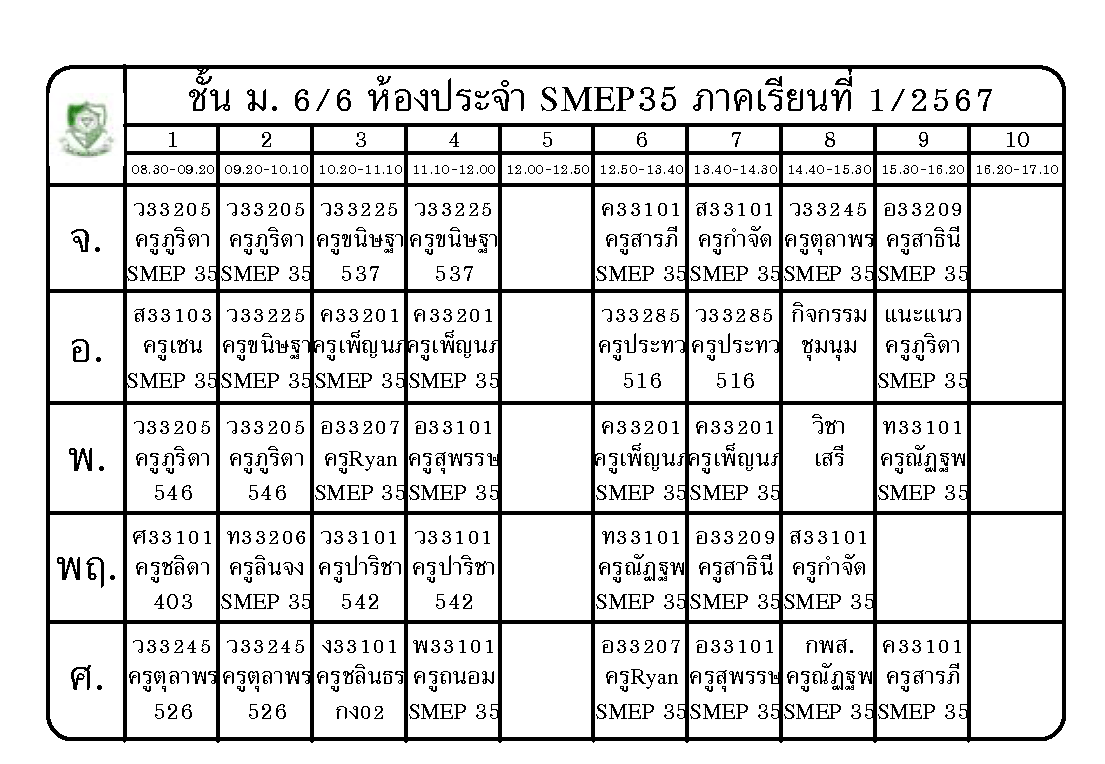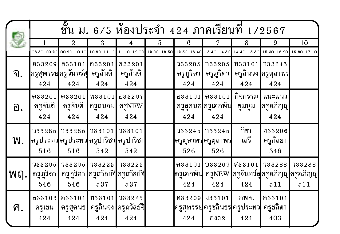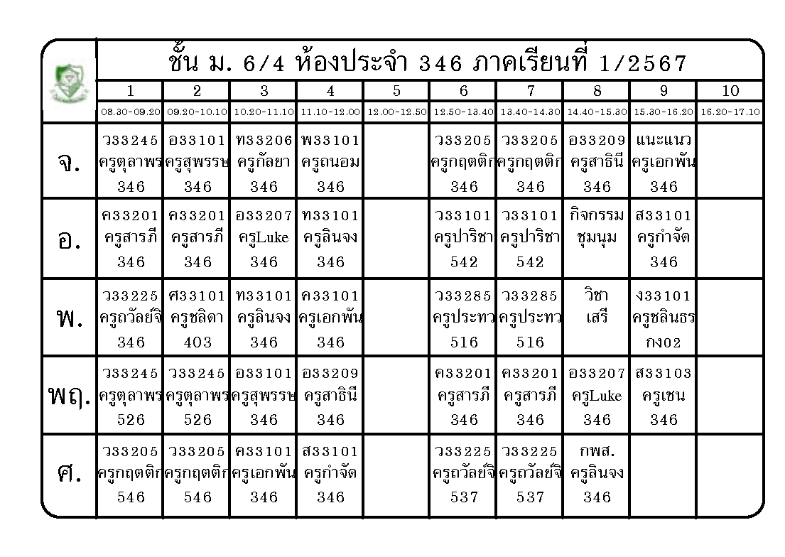 ตารางเรียน นักเรียนชั้นมัธยมศึกษาปีที่ 6 ภาคเรียนที่ 1 ปีการศึกษา 2567