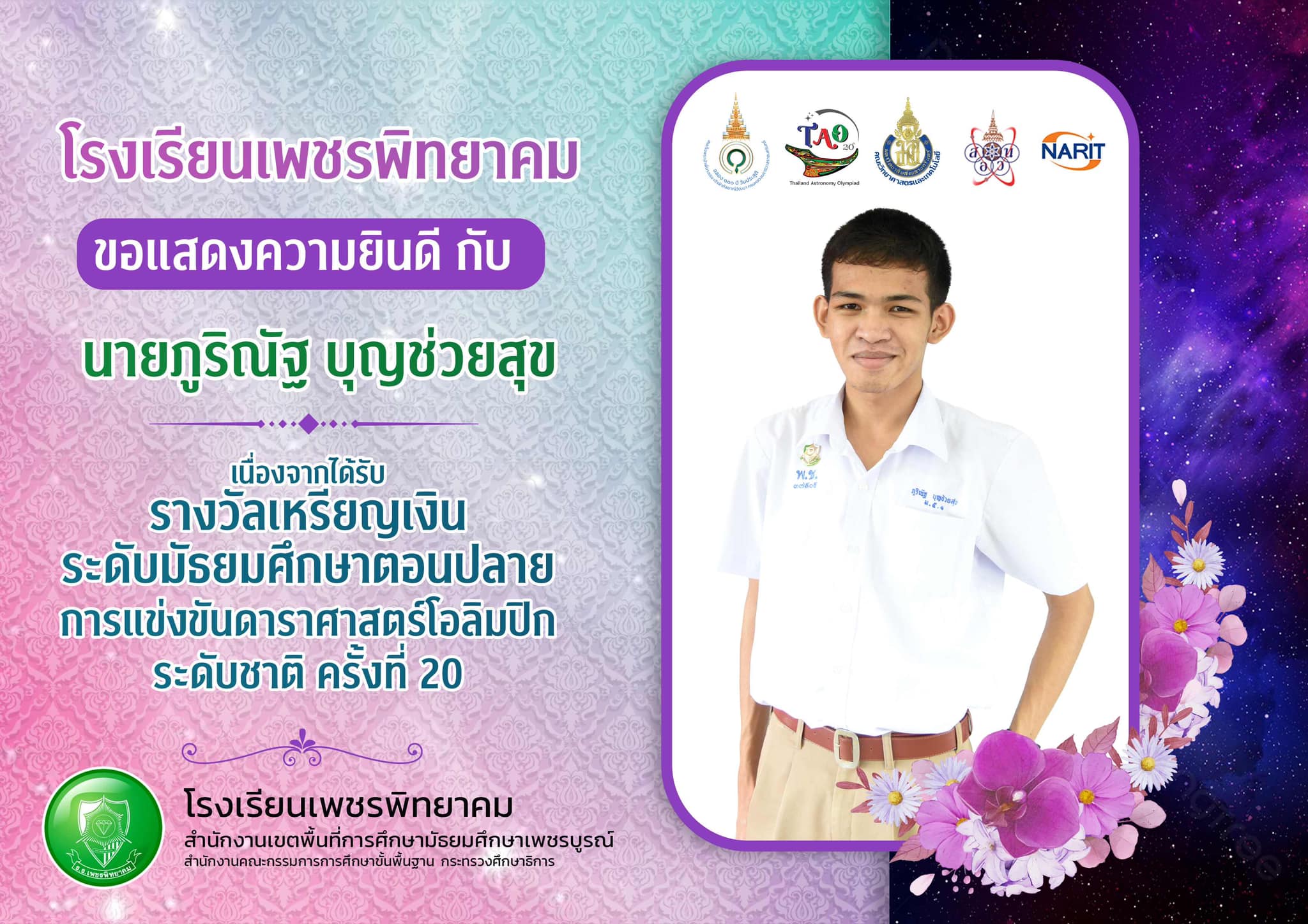 ขอแสดงความยินดี กับนายภูริณัฐ บุญช่วยสุข ได้รางวัลเหรียญเงิน ระดับมัธยมศึกษาตอนปลาย การแข่งข้นดาราศาสตร์โอลิมปิกระดับชาติ ครั้งที่ 20