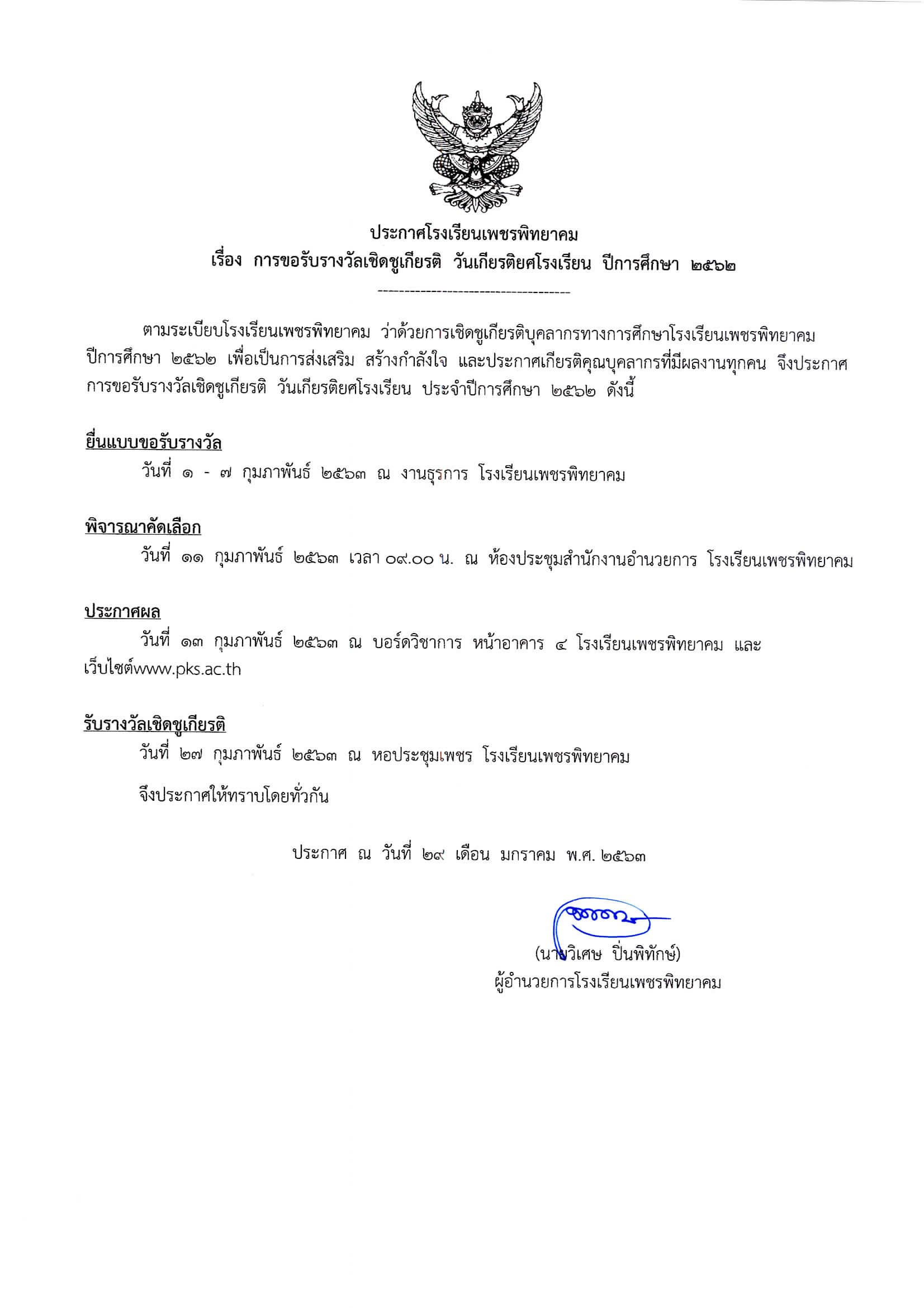 ประกาศโรงเรียนเพชรพิทยาคม เรื่องการขอรับรางวัลเชิดชูเกียรติ วันเกียรติยศโรงเรียน ปีการศึกษา 2562