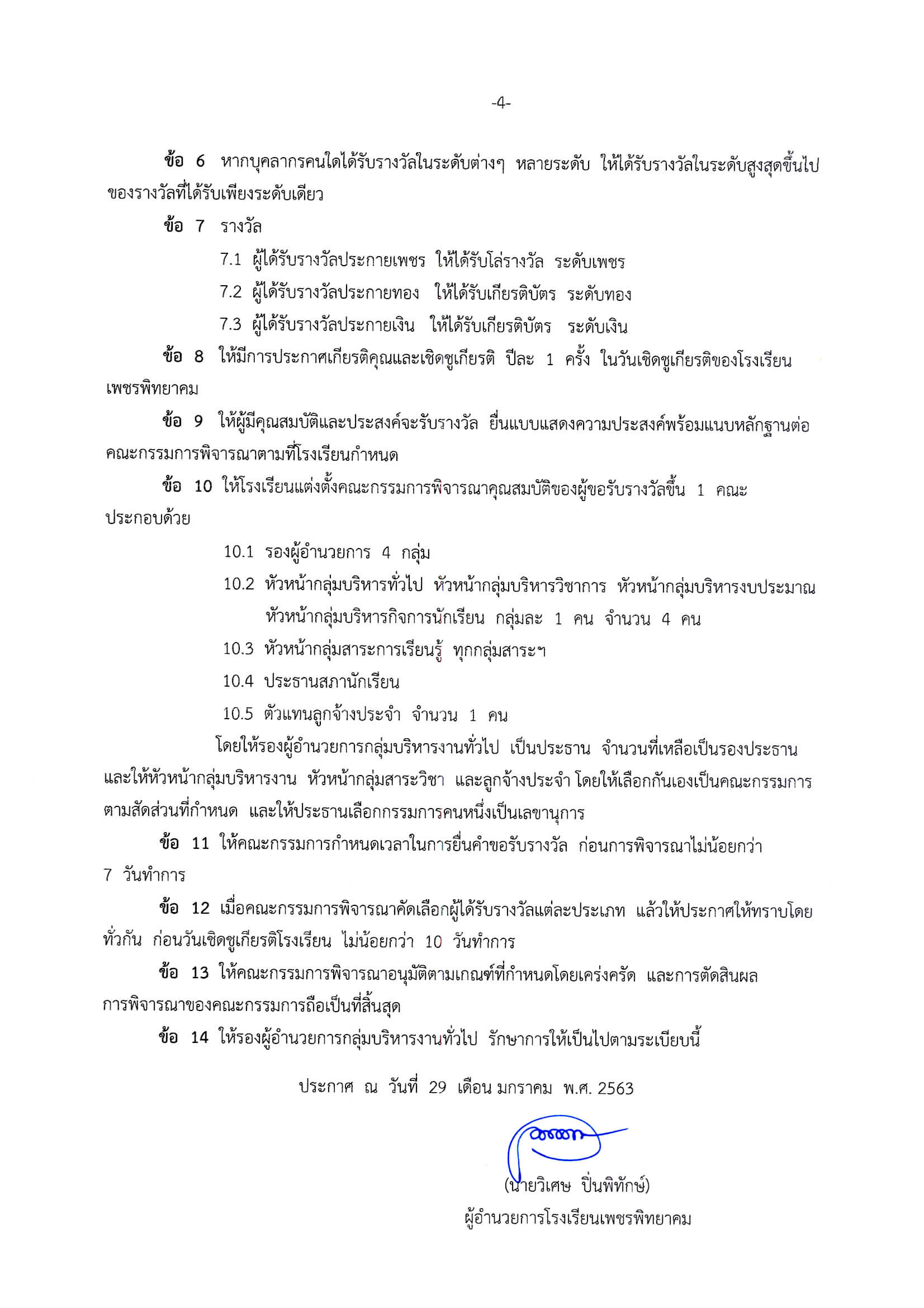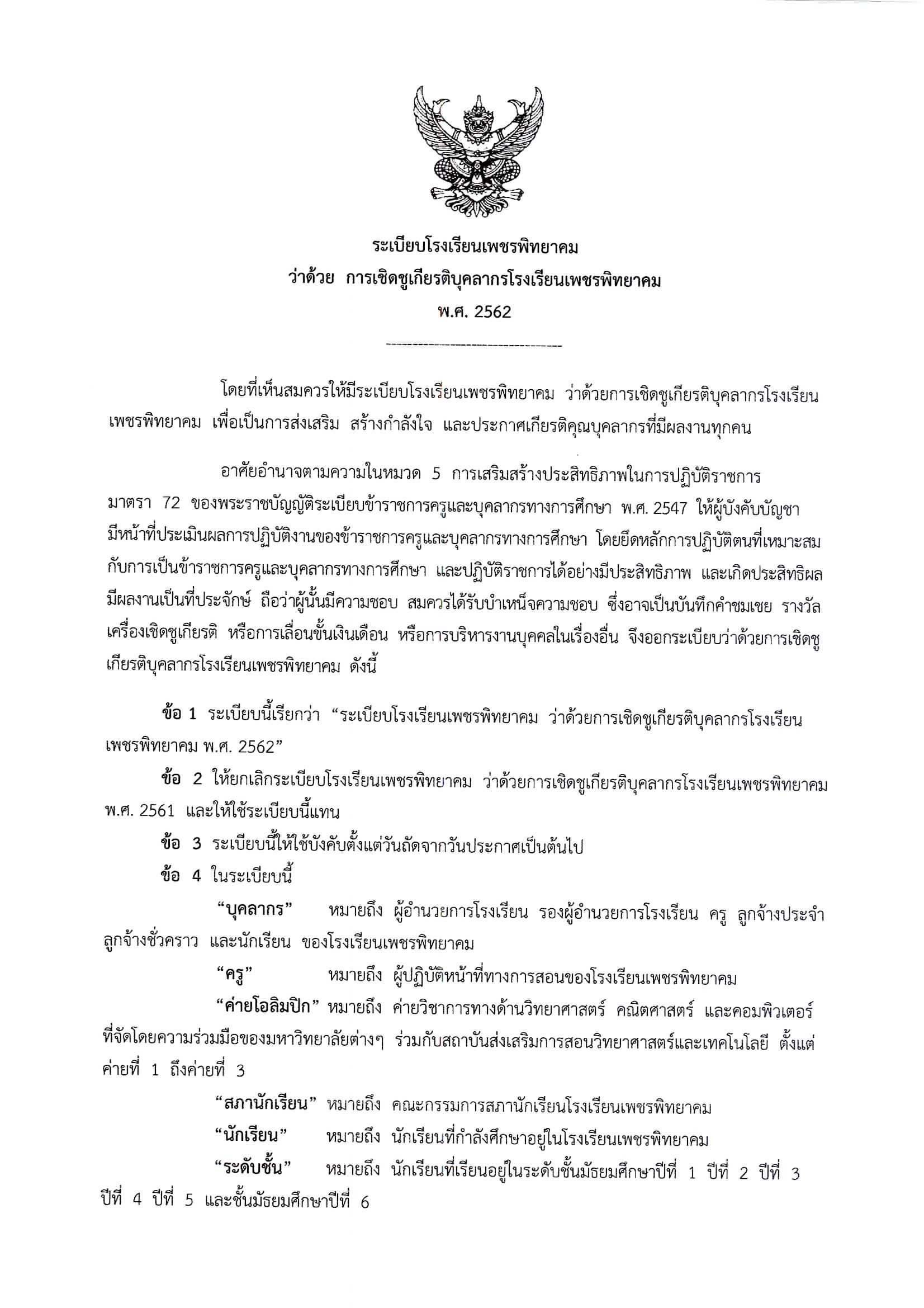 2) ระเบียบฯ การเชิดชูเกียรติบุคลากรโรงเรียนเพชรพิทยาคม พ.ศ. 2562