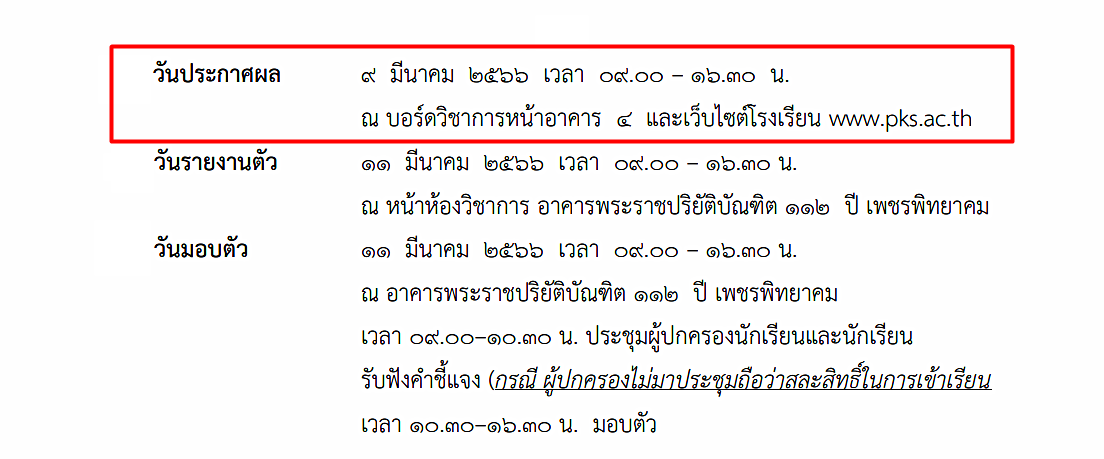 ตารางสอบคัดเลือกเข้าศึกษาต่อระดับมัธยมศึกษาปีที่ 4 ปีการศึกษา 2566 (ประเภทห้องเรียนพิเศษ) วันที่ 5 มีนาคม 2566