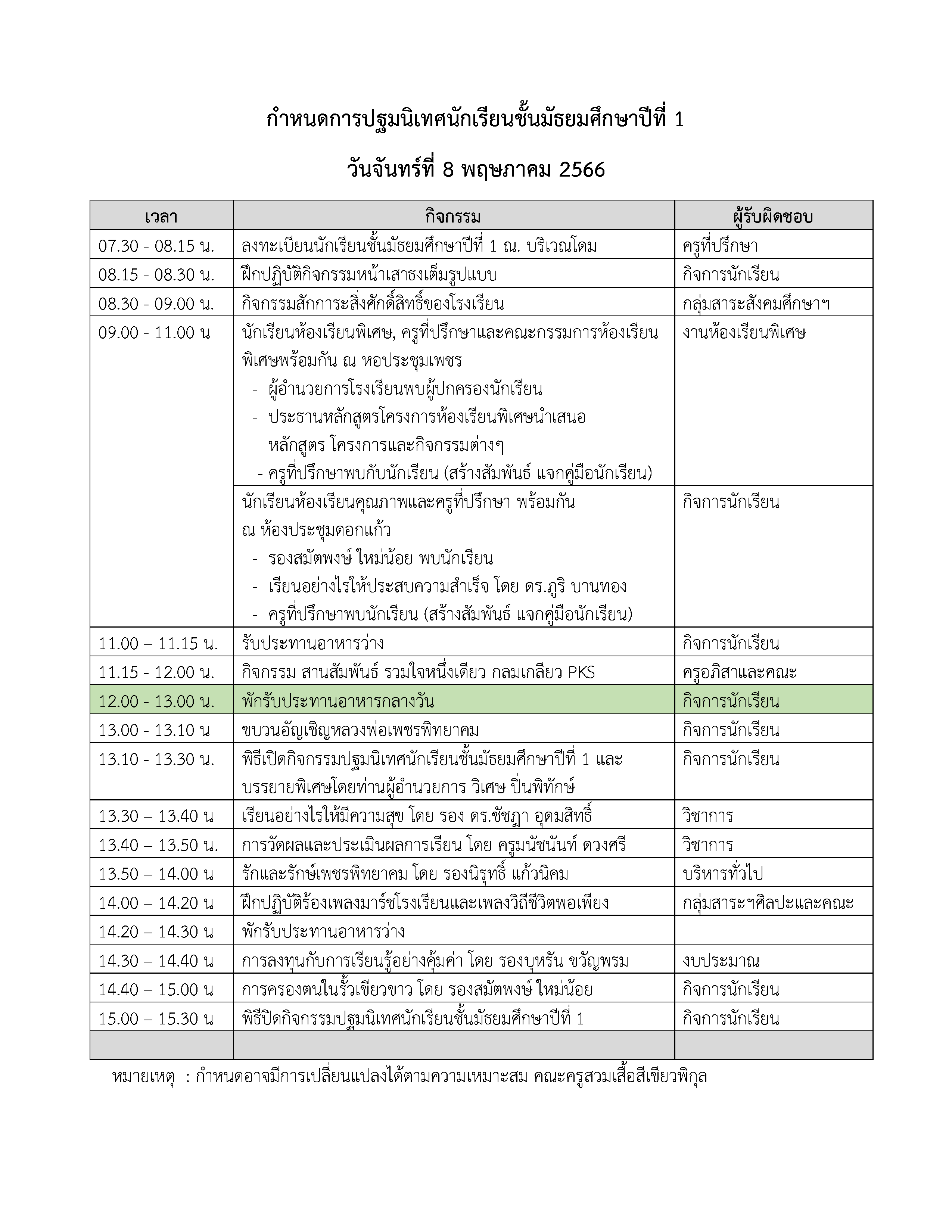 กำหนดการปฐมนิเทศนักเรียนชั้นมัธยมศึกษาปีที่ 1