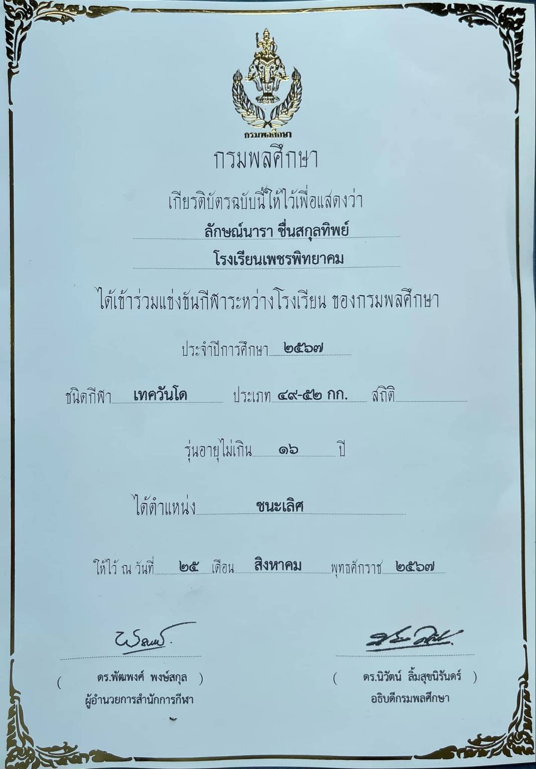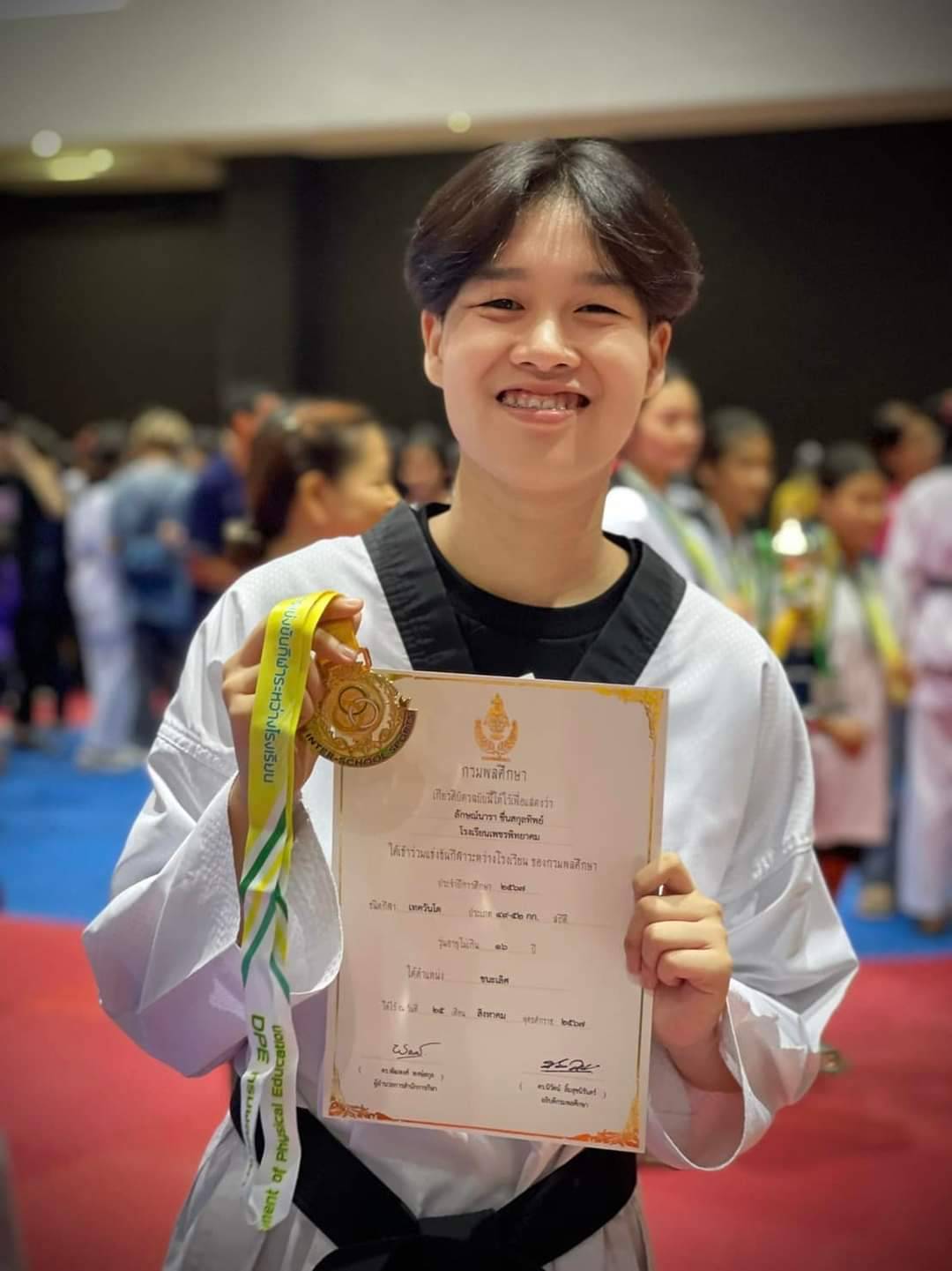 จากการแข่งขันกีฬาระหว่างโรงเรียน ประจำปีการศึกษา 2567 สังกัดกรมพลศึกษา กีฬาเทควันโด รุ่นอายุไม่เกิน 16 ปี น้ำหนักไม่เกิน 49 - 52 กก. หญิง รางวัลเหรียญทอง ชนะเลิศ จัดขึ้นระหว่างวันที่ 21-26 สิงหาคม 2567 ณ สนามกีฬาเฉลิมพระเกียรติฯ อำเภอธัญบุรี จังหวัดปทุมธานี