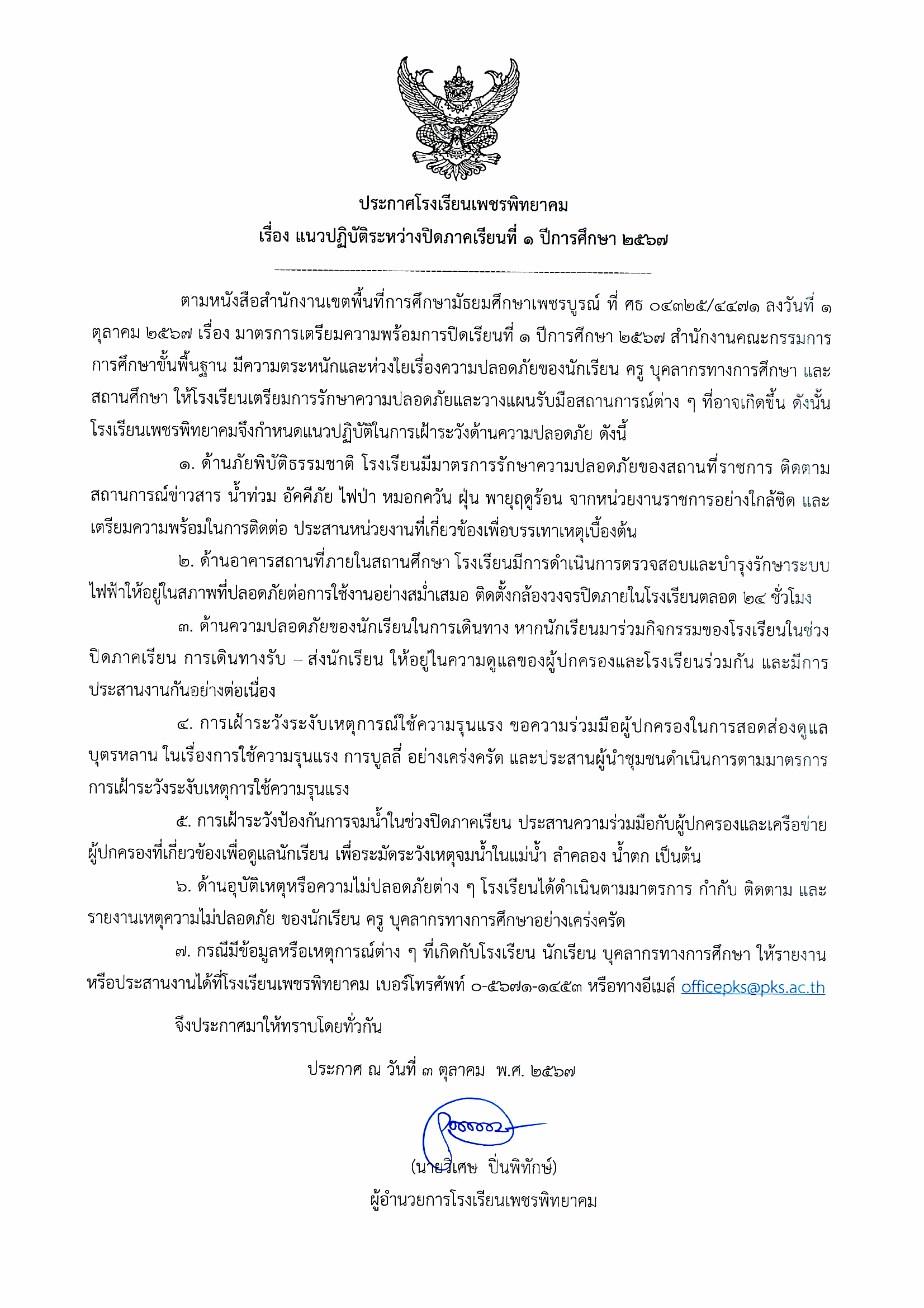 ประกาศโรงเรียนเพชรพิทยาคม เรื่อง แนวปฏิบัติระหว่างปิดภาคเรียนที่ 1 ปีการศึกษา 2567