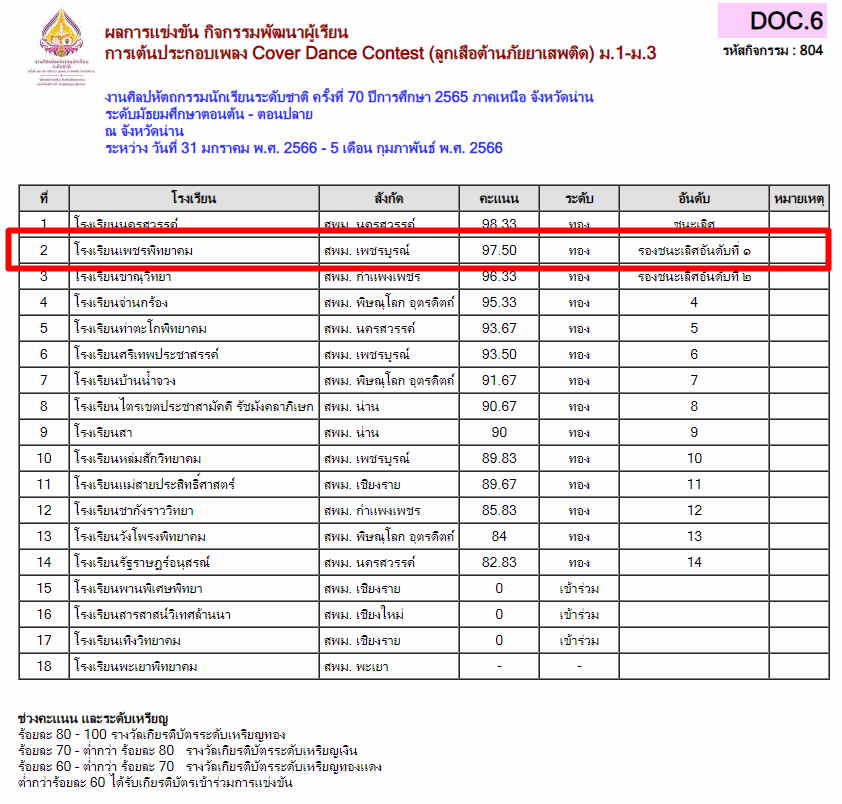 โรงเรียนเพชรพิทยาคม สพม.เพชรบูรณ์ รับรางวัลทอง รองชนะเลิศอันดับที่ 1 จากการแข่งขันการเต้นประกอบเพลง Cover Dance Contest (ลูกเสือต้านภัยยาเสพติด) ม.1-ม.3 กลุ่มกิจกรรมพัฒนาผู้เรียน
