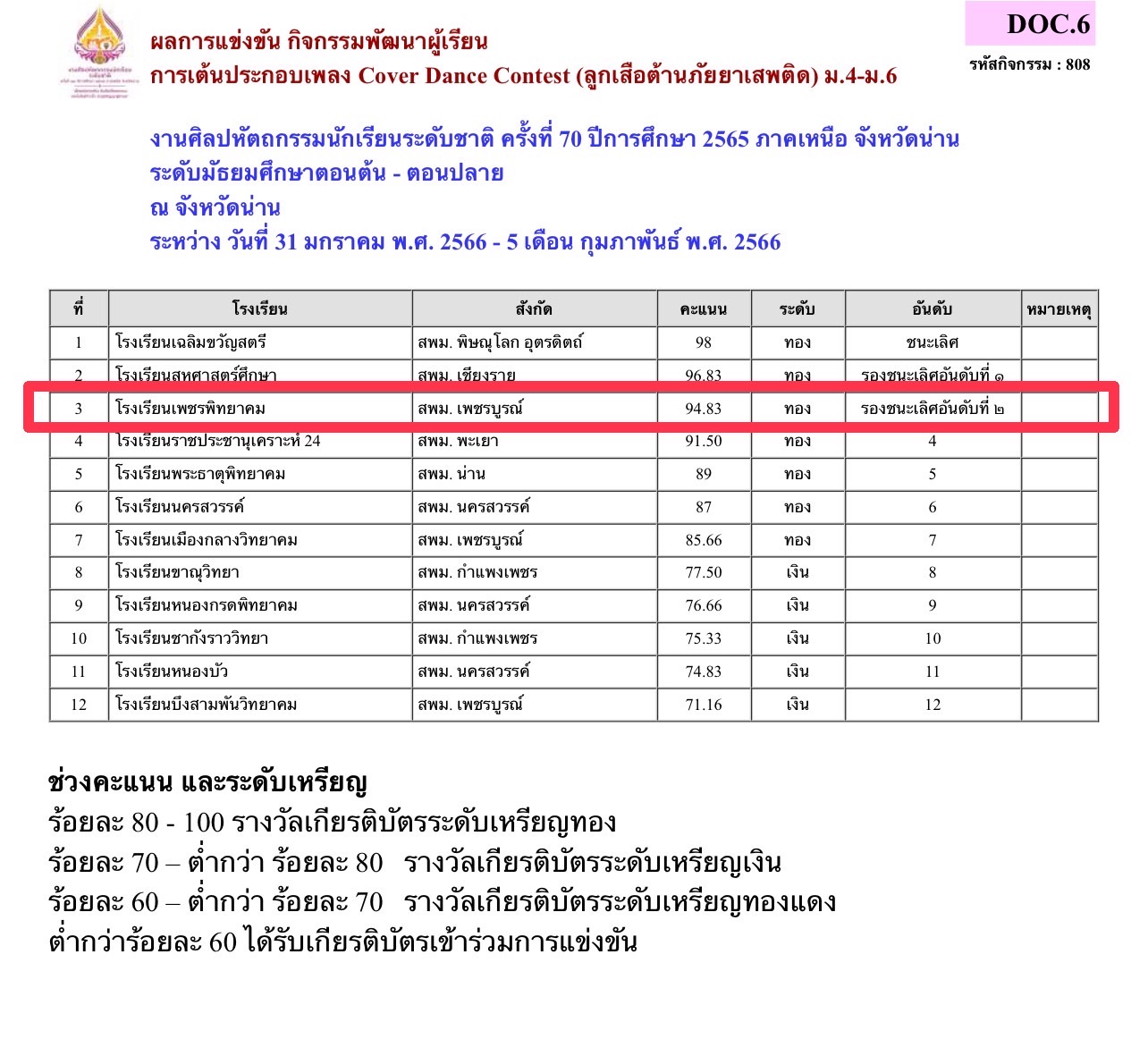 โรงเรียนเพชรพิทยาคม สพม.เพชรบูรณ์ รับรางวัลเหรียญทอง รองชนะเลิศอันดับ 2 จากการเต้นประกอบเพลง Cover Dance Contest (ลูกเสือต้านภัยยาเสพติด) ม.4-ม.6 กลุ่มกิจกรรมพัฒนาผู้เรียน