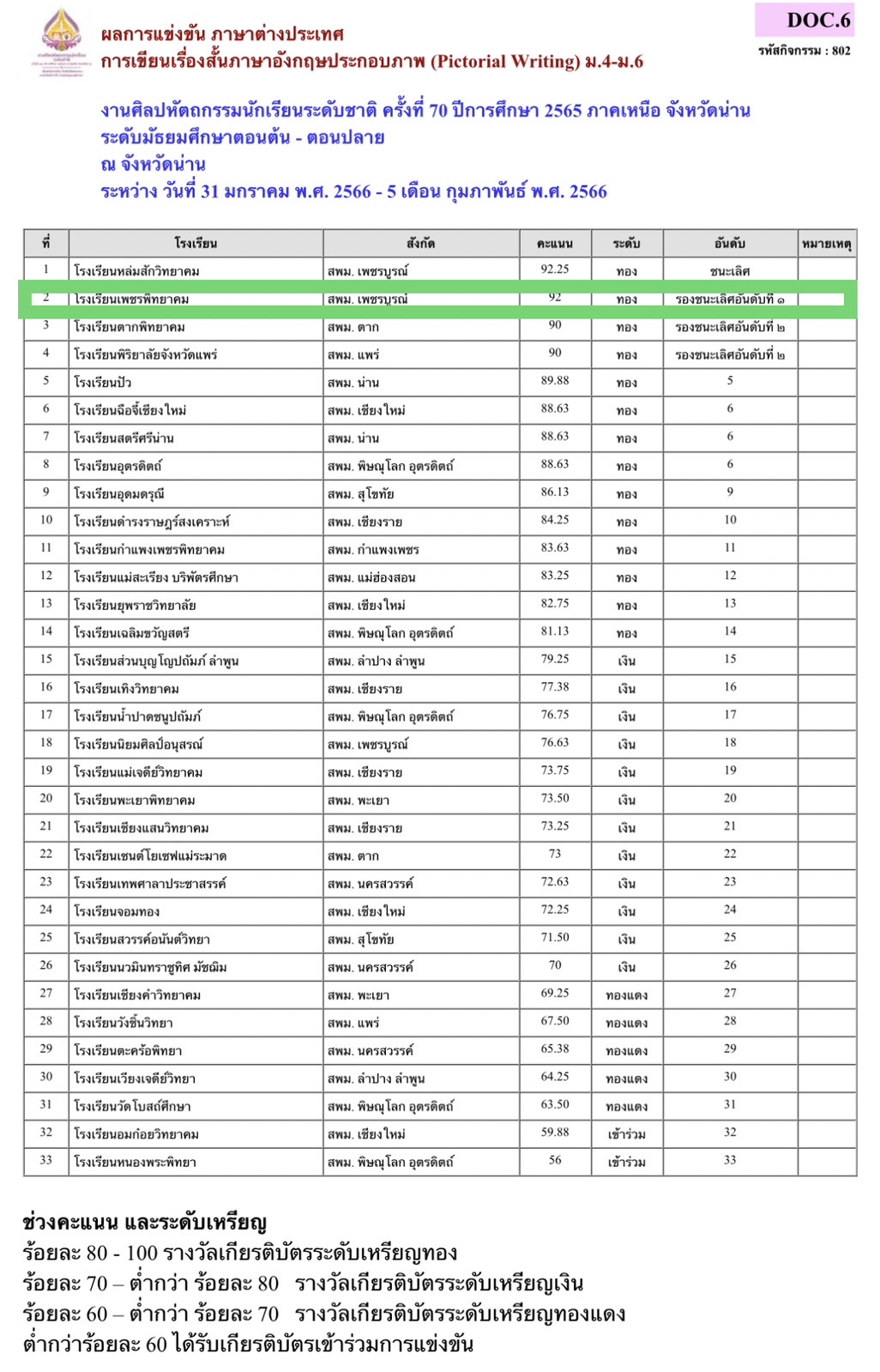 โรงเรียนเพชรพิทยาคม สพม.เพชรบูรณ์ รับรางวัลเหรียญทอง รองชนะเลิศอันดับที่ 1 จากการเขียนเรื่องสั้นภาษาอังกฤษประกอบภาพ (Pictorial Writing) ม.4-ม.6 กลุ่มสาระฯ ภาษาต่างประเทศ