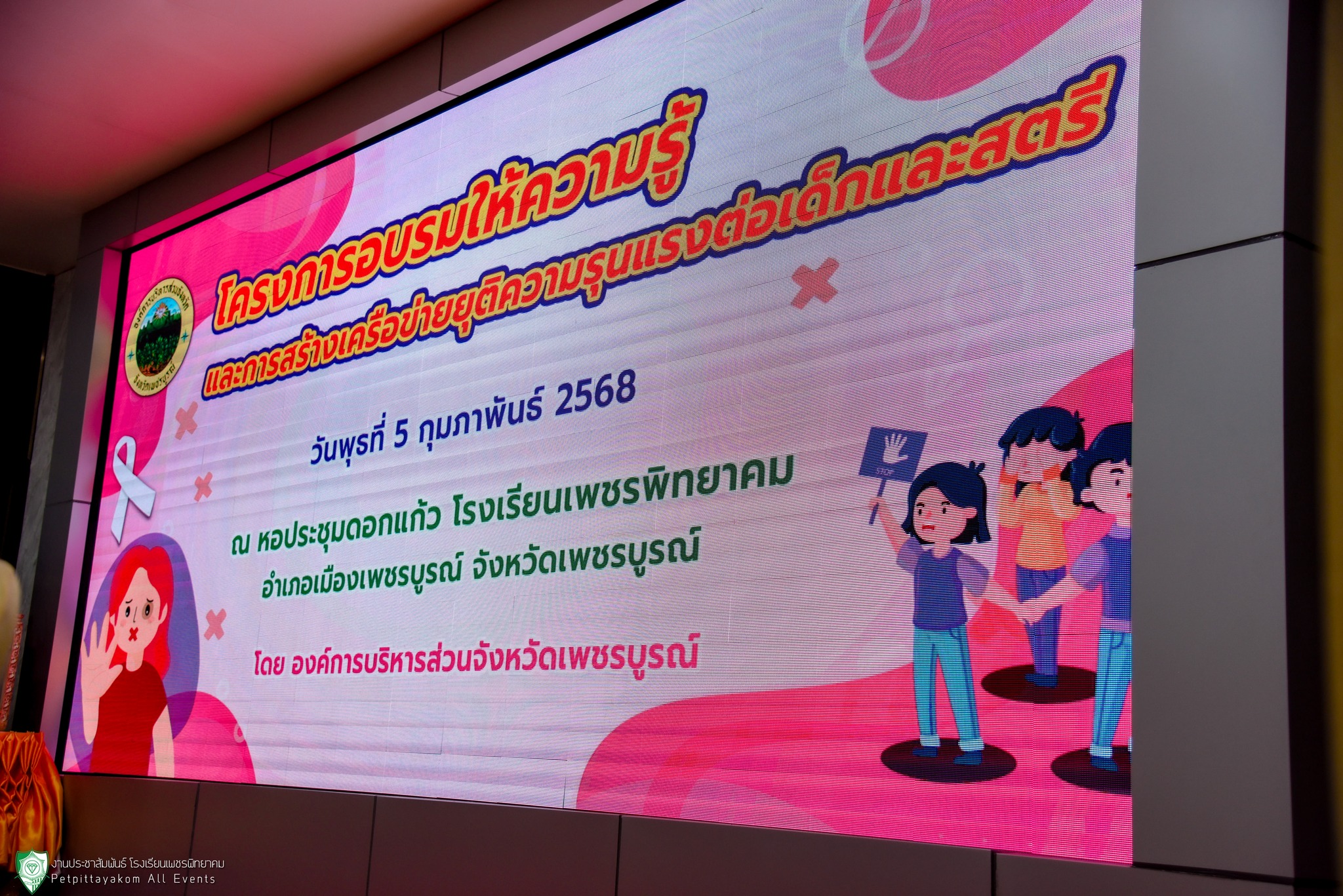 โรงเรียนเพชรพิทยาคมร่วมกับองค์การบริหารส่วนจังหวัดเพชรบูรณ์ดำเนินการจัดโครงการอบรมให้ความรู้และการสร้างเครือข่ายยุติความรุนแรงต่อเด็กและสตรี ซึ่งกลุ่มเป้าหมายเป็นนักเรียนระดับชั้นมัธยมศึกษาปีที่ 5 จำนวน 150 คนโดยมี นายณรงค์ศักดิ์ หอมมาลัย รองนายกองค์การบริหารส่วนจังหวัดเพชรบูรณ์ เป็นประธานพิธี พร้อมด้วยคณะผู้บริหารโรงเรียนเพชรพิทยาคม หัวหน้าส่วนราชการองค์การบริหารส่วนจังหวัดเพชรบูรณ์ เข้าร่วมกิจกรรม เมื่อวันที่ 5 กุมภาพันธ์ 2568 ณ หอประชุมดอกแก้ว โรงเรียนเพชรพิทยาคม อำเภอเมืองเพชรบูรณ์ จังหวัดเพชรบูรณ์