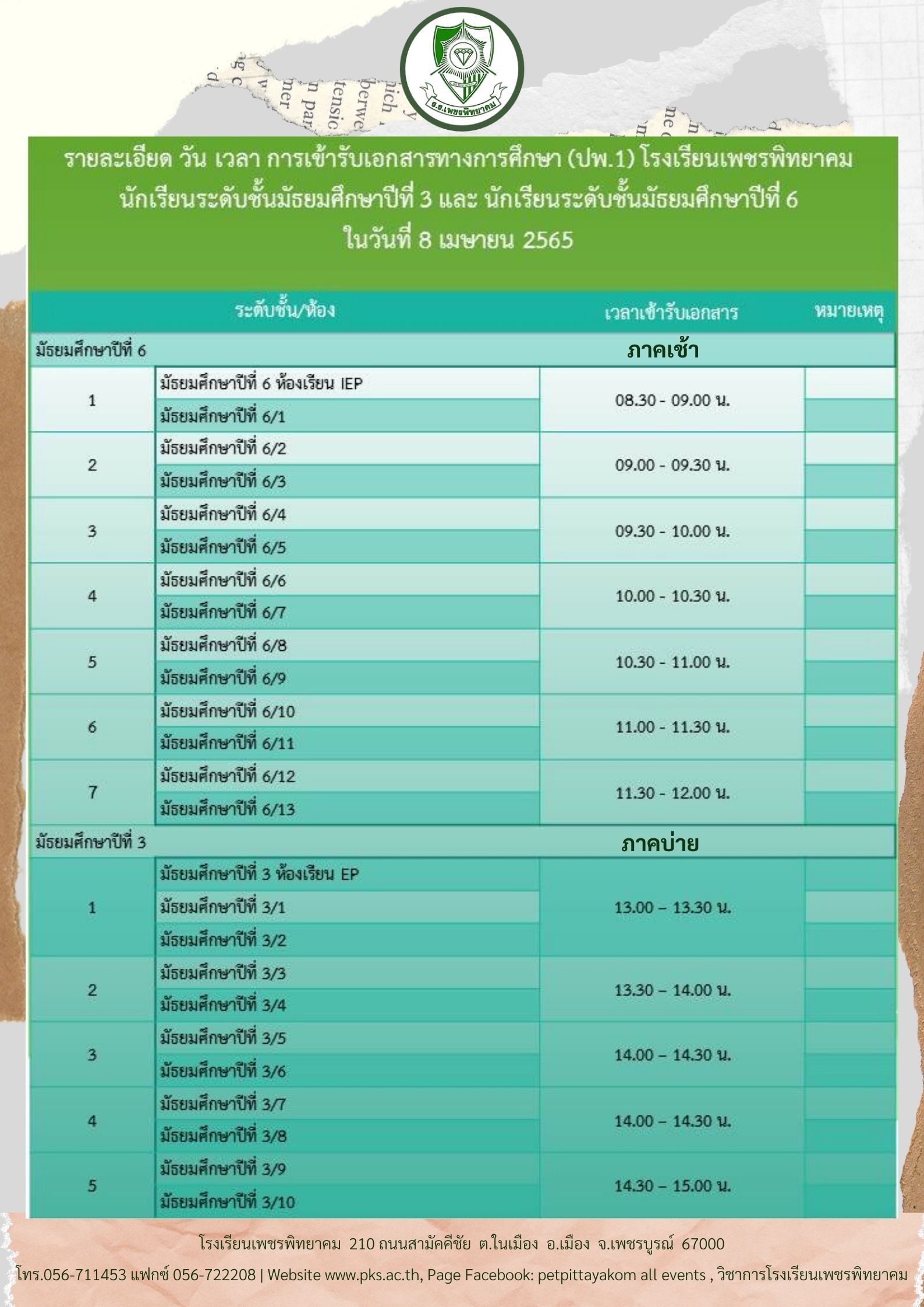รายละเอียด วัน เวลา การเข้ารับเอกสารทางการศึกษา (ปพ.1) โรงเรียนเพชรพิทยาคม นักเรียนระดับชั้นมัธยมศึกษาปีที่ 3 และ นักเรียนระดับชั้นมัธยมศึกษาปีที่ 6 ในวันที่ 8 เมษายน 2565