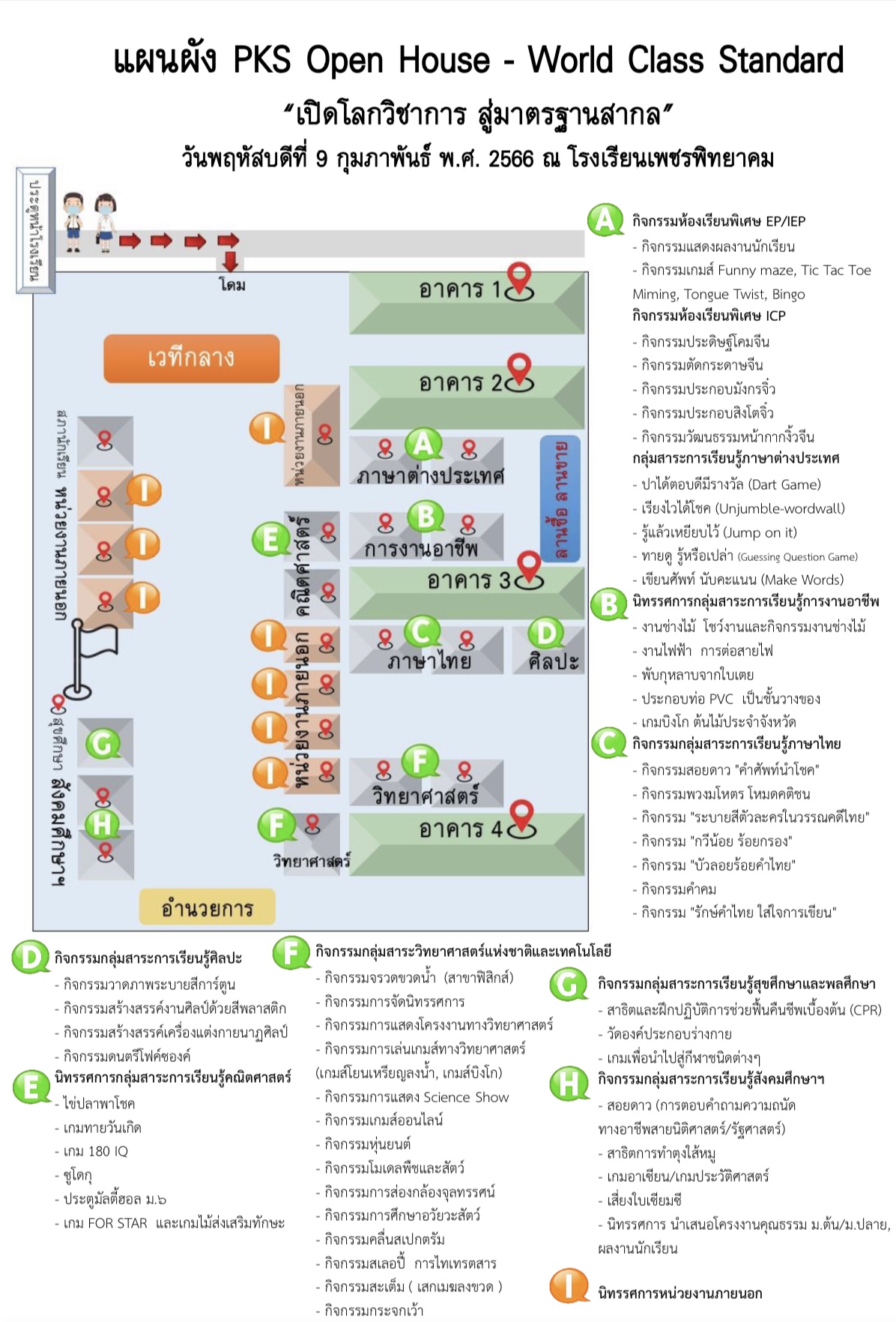 แผนผัง PKS Open House - World Class Standard “เปิดโลกวิชาการ สู่มาตรฐานสากล” วันพฤหัสบดีที่ 9 กุมภาพันธ์ พ.ศ. 2566 ณ โรงเรียนเพชรพิทยาคม