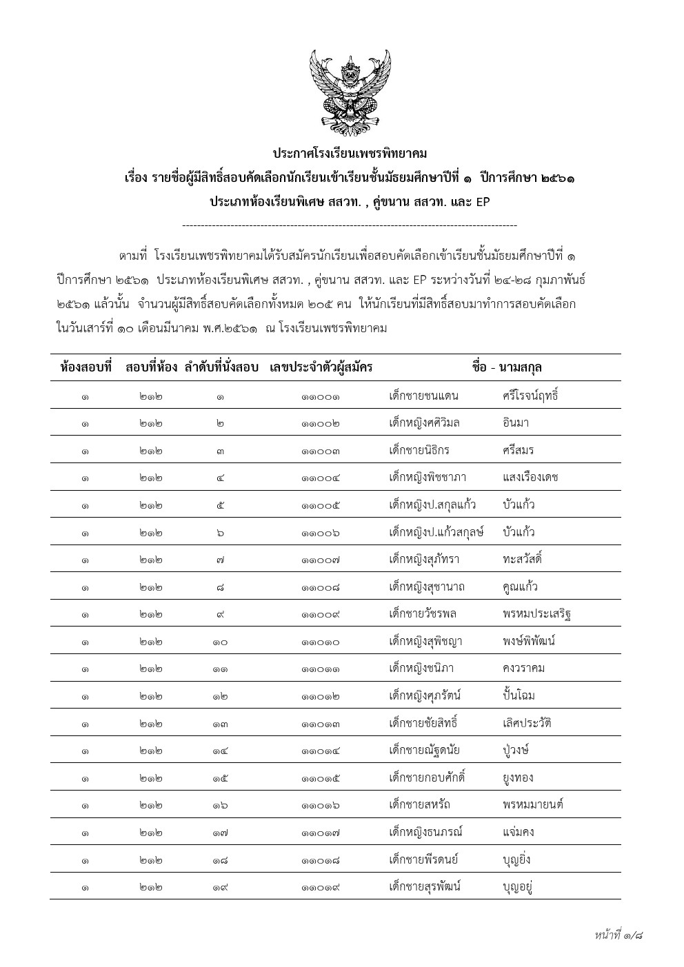 ประกาศรายชื่อผู้มีสิทธิ์สอบคัดเลือกนักเรียนเข้าเรียนชั้นมัธยมศึกษาปีที่ 1 ปีการศึกษา 2561 ประเภทห้องเรียนพิเศษ สสวท. , คู่ขนาน สสวท. และ EP