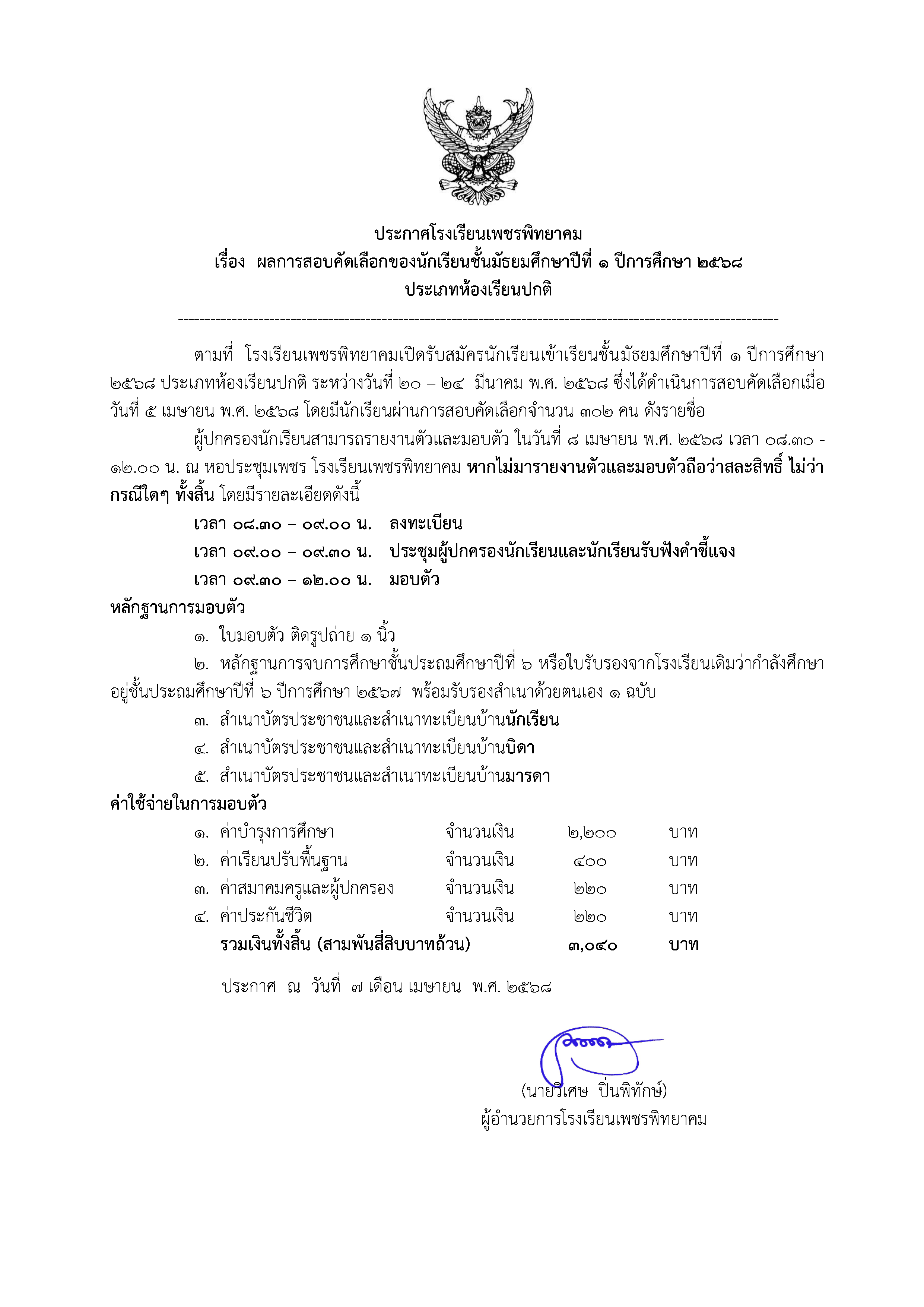 ประกาศโรงเรียนเพชรพิทยาคม เรื่อง ผลการสอบคัดเลือกของนักเรียนชั้นมัธยมศึกษาปีที่ 1 ปีการศึกษา 2568 ประเภทห้องเรียนปกติ