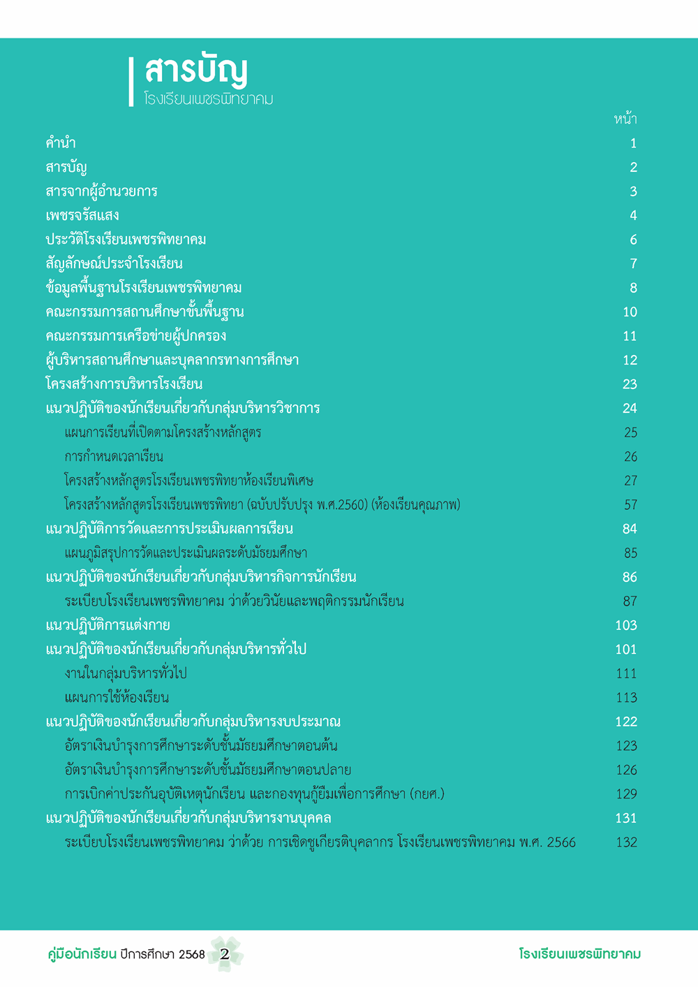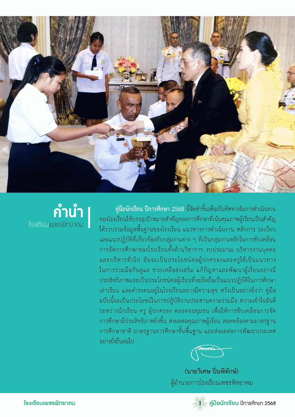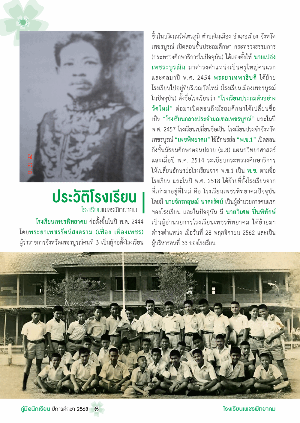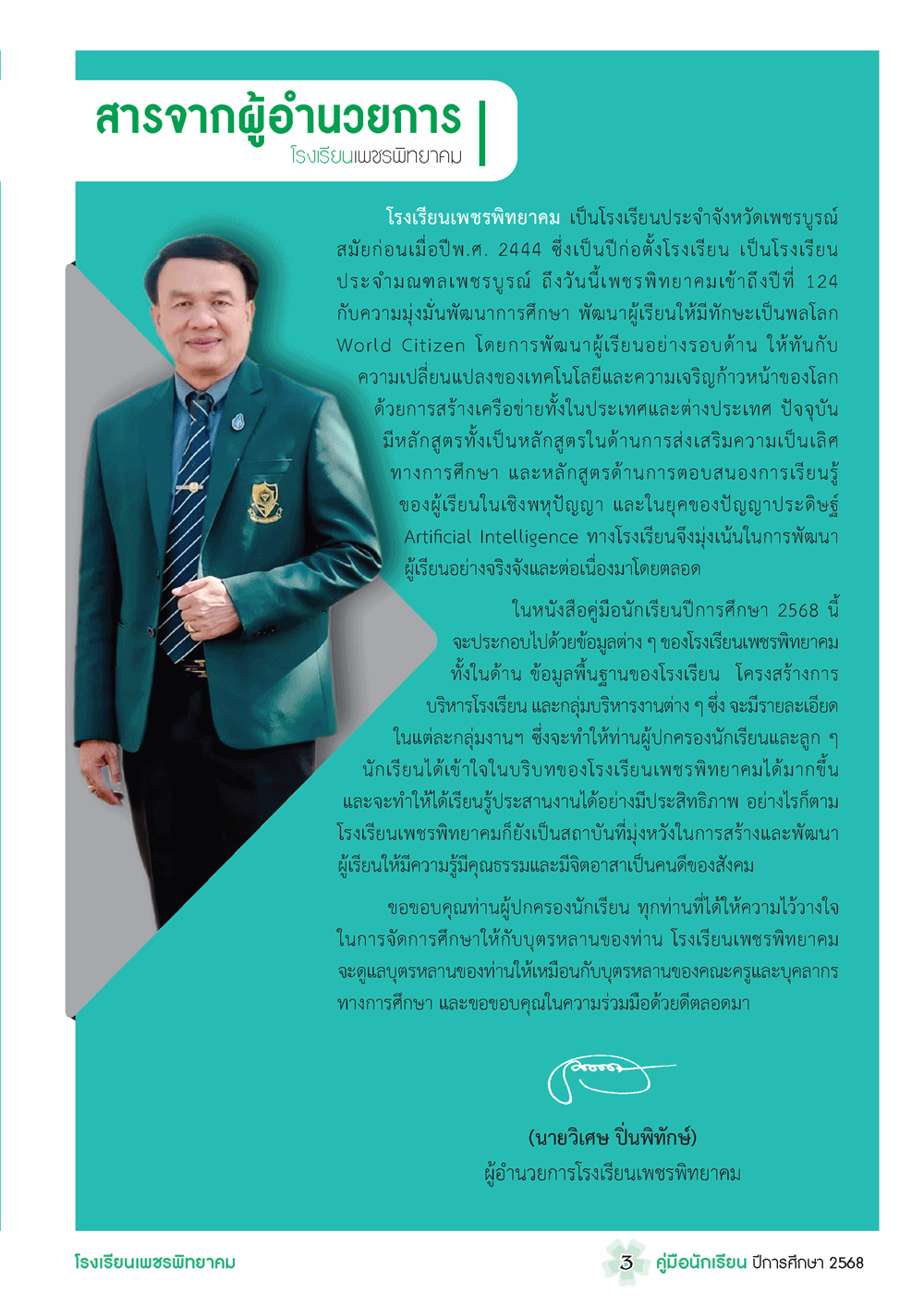 โรงเรียนเพชรพิทยาคม สังกัดสำนักงานเขตพื้นที่การศึกษามัธยมศึกษาเพชรบูรณ์ ได้จัดทำ คู่มือนักเรียน ปีการศึกษา 2568 เพื่อใช้เป็นแนวทางสำคัญในการขับเคลื่อนการจัดการศึกษาอย่างมีคุณภาพ โดยมุ่งเน้น “ผู้เรียนเป็นศูนย์กลาง” และสนับสนุนการทำงานร่วมกันของนักเรียน ครู ผู้ปกครอง และชุมชน