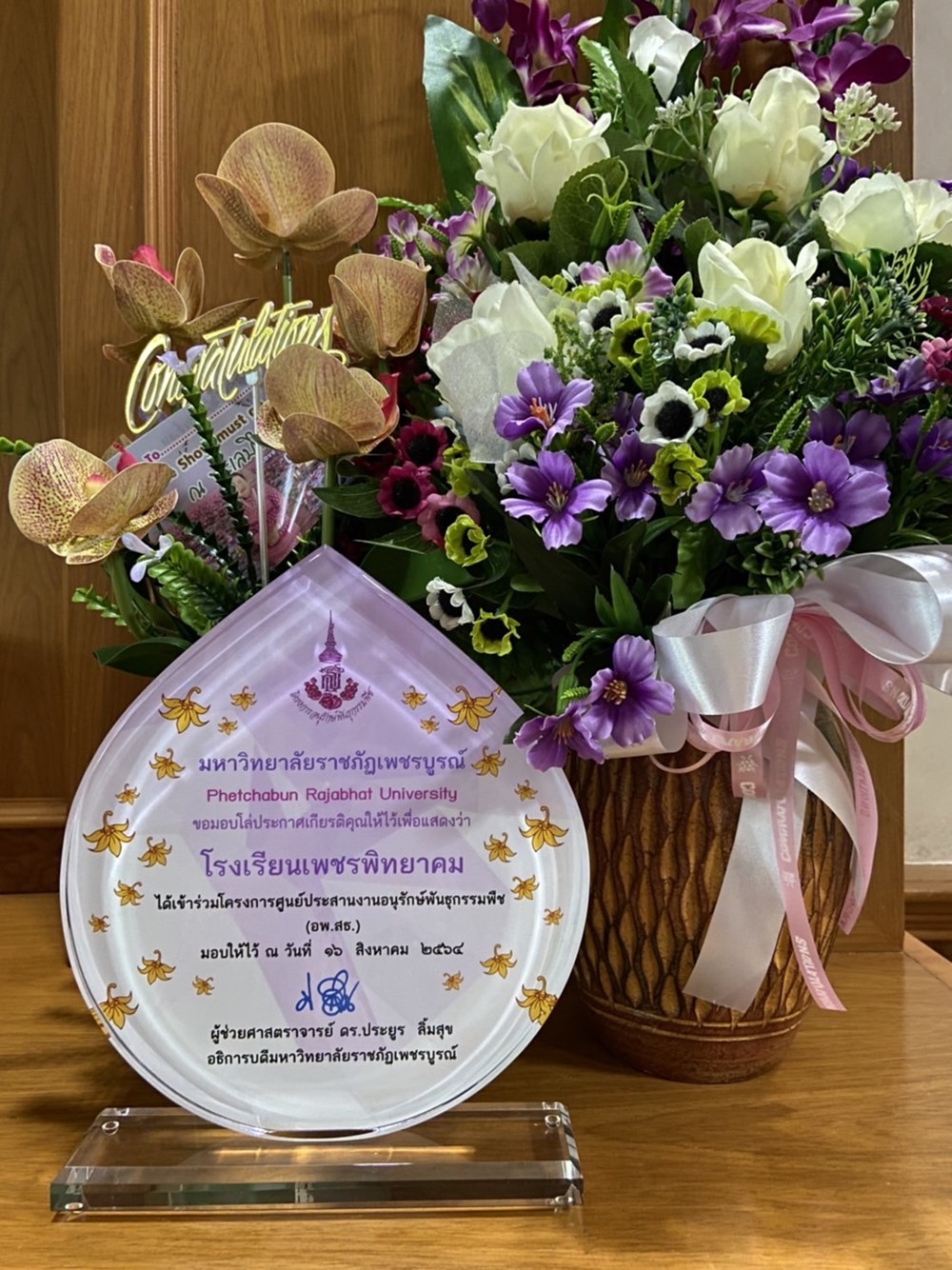 นายวิเศษ ปิ่นพิทักษ์ ผู้อำนวยการโรงเรียนเพชรพิทยาคมพร้อมด้วยตัวแทนครูรับมอบโล่ประกาศเกียรติคุณจากการเข้าร่วมงานสวนพฤกศาสตร์โรงเรียน ในโครงการศูนย์ประสานงานอนุรักษ์พันธุกรรมพืช อันเนื่องมาจากพระราชดำริสมเด็จพระเทพรัตนราชสุดาฯ สยามบรมราชกุมารี (อพ.สธ.) จากมหาวิทยาลัยราชภัฏเพชรบูรณ์ เมื่อวันที่ 7 ตุลาคม 2564 ณ ตึกสำนักงานอำนวยการ โรงเรียนเพชรพิทยาคม