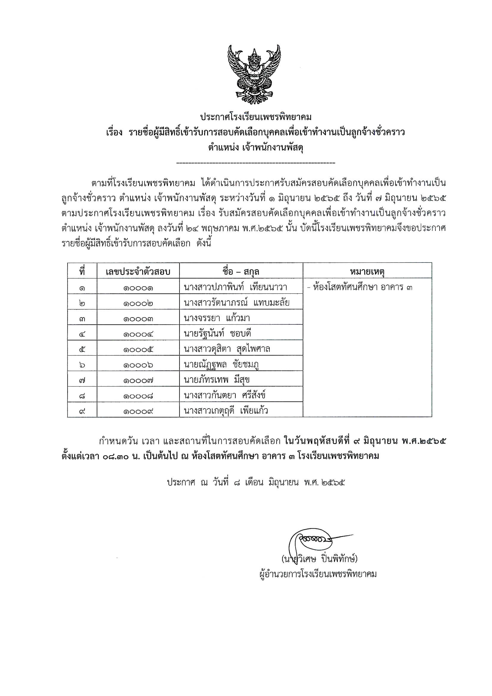 ประกาศโรงเรียนเพชรพิทยาคม เรื่อง รายชื่อผู้มีสิทธิ์เข้ารับการสอบคัดเลือกบุคคลเพื่อเข้าทำงานเป็นลูกจ้างชั่วคราว ตำแหน่ง เจ้าพนักงานพัสดุ