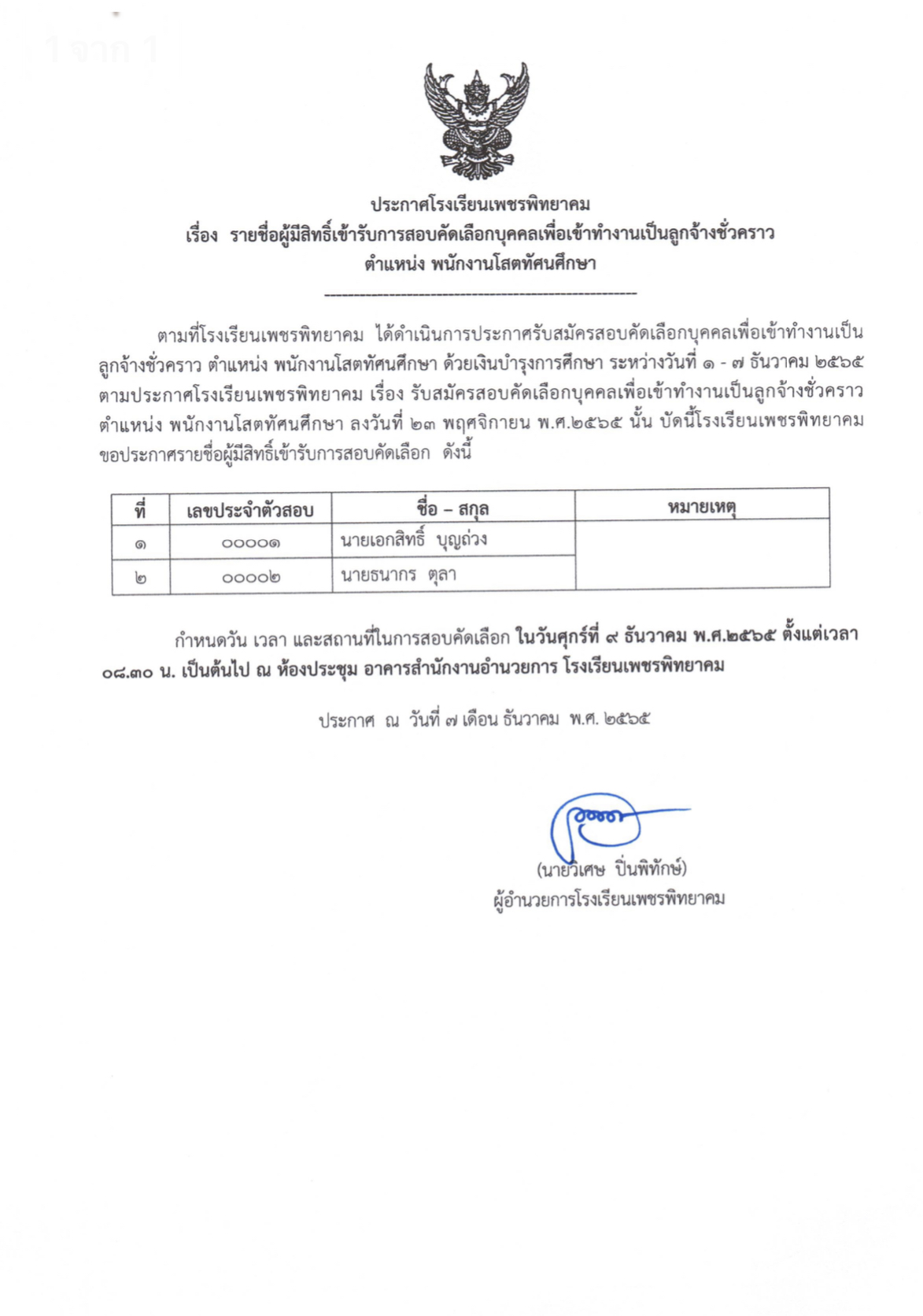 ประกาศโรงเรียนเพชรพิทยาคม เรื่อง รายชื่อผู้มีสิทธิ์เข้ารับการสอบคัดเลือกบุคคลเพื่อเข้าทำงานเป็นลูกจ้างชั่วคราว ตำแหน่ง พนักงานโสตทัศนศึกษา