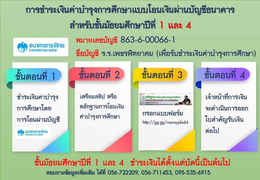 การชำระเงินค่าบำรุงการศึกษาแบบโอนเงินผ่านบัญชีธนาคาร สำหรับนักเรียนชั้น ม.1 และ ม.4