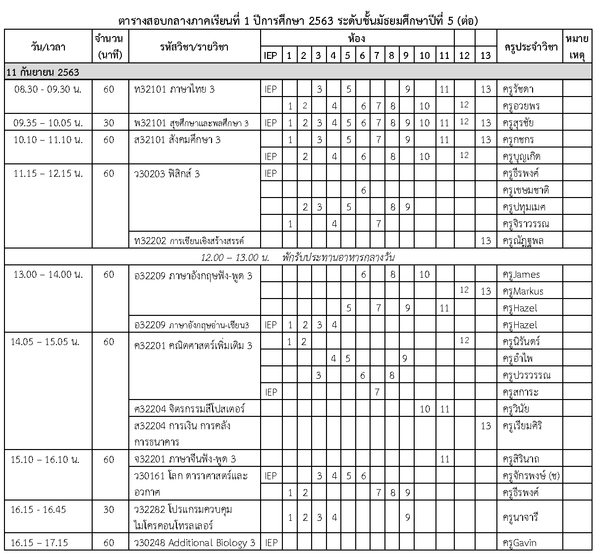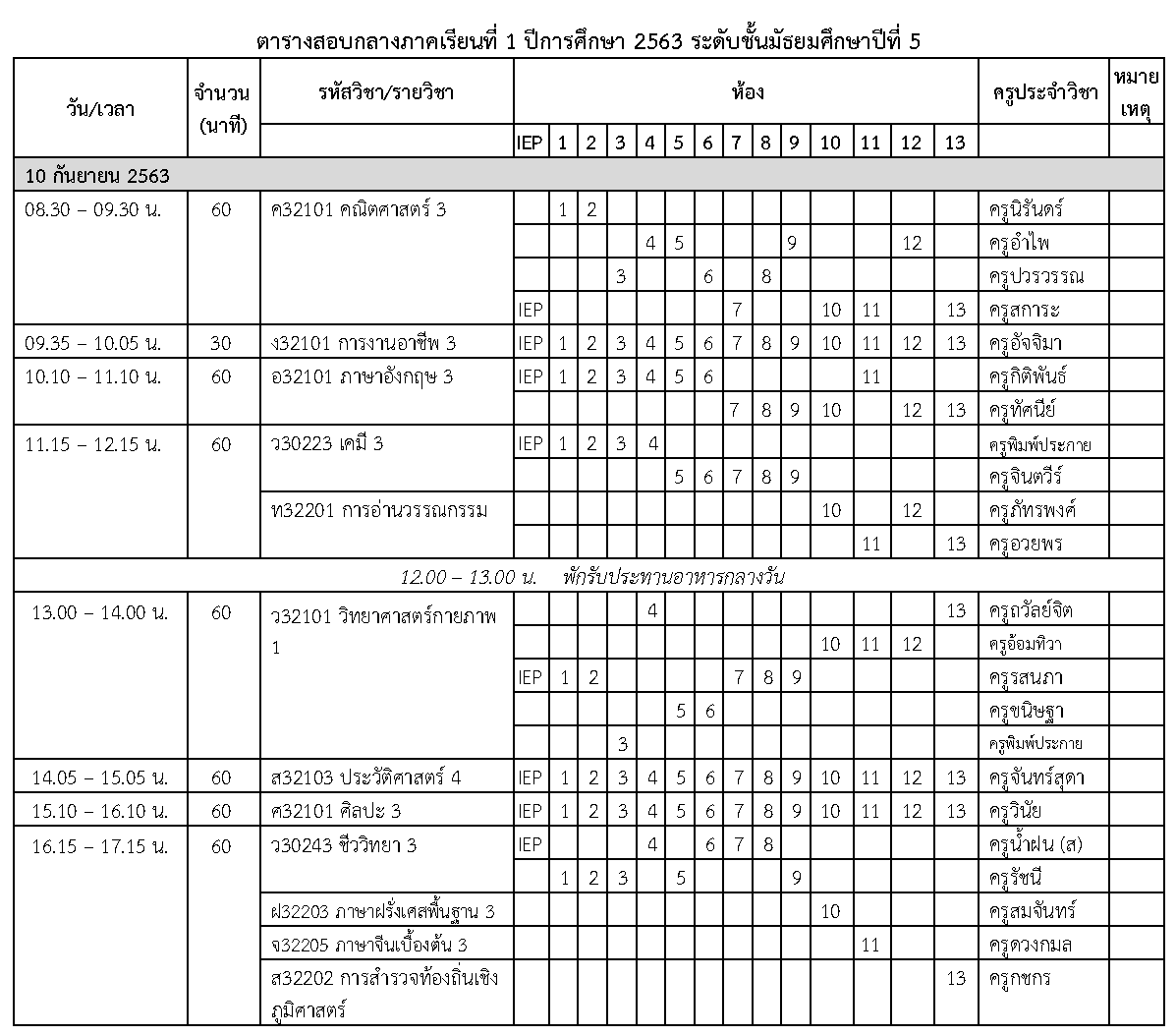 ตารางสอบกลางภาคเรียนที่ 1 ปีการศึกษา 2563 ระดับชั้นมัธยมศึกษาปีที่ 5