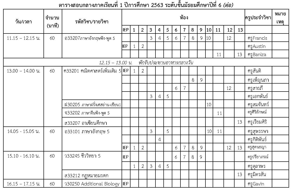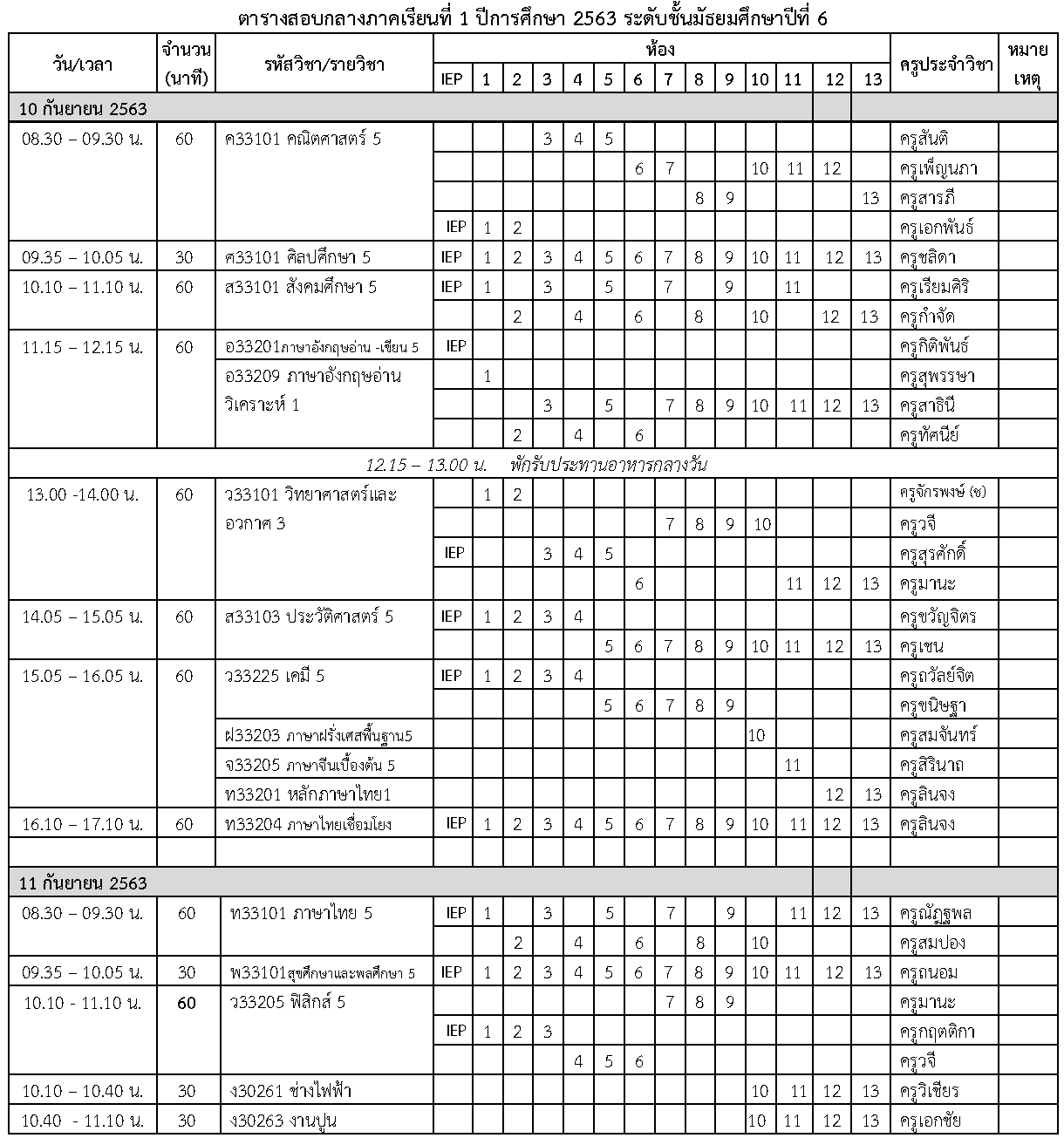 ตารางสอบกลางภาคเรียนที่ 1 ปีการศึกษา 2563 ระดับชั้นมัธยมศึกษาปีที่ 6