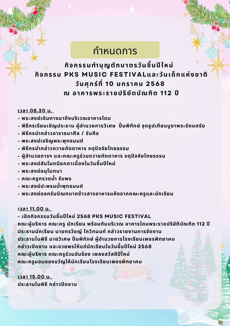 กำหนดการ กิจกรรมทำบุญตักบาตรวันขึ้นปีใหม่ กิจกรรม PKS MUSIC FESTIVALและวันเด็กแห่งชาติ วันศุกร์ที่ 10 มกราคม 2568 ณ อาคารพระราชปริยัตบัณฑิต 112 ปี