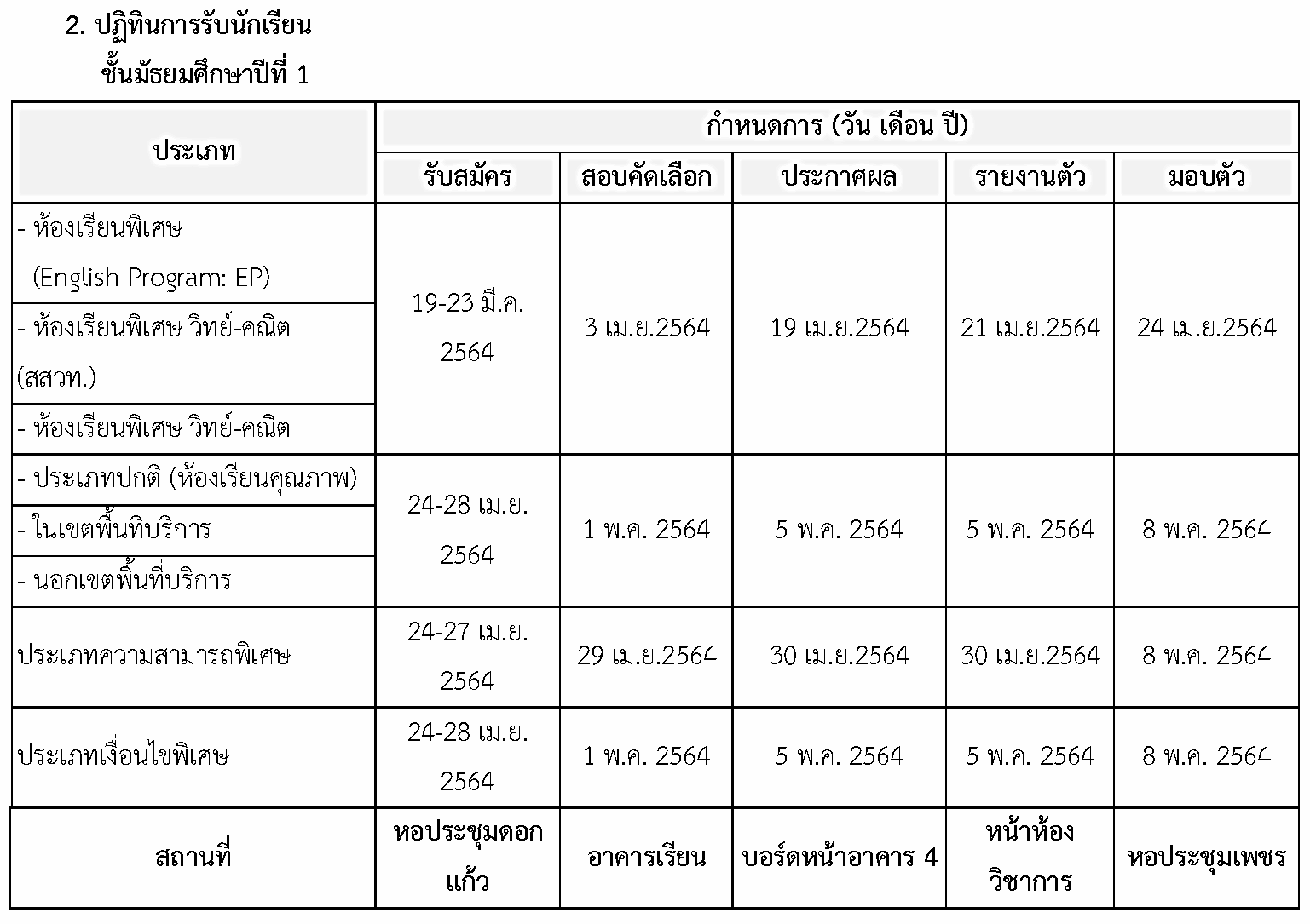 ปฏิทินการรับนักเรียนเพื่อศึกษาต่อชั้นมัธยมศึกษาปีที่ 1 และ ชั้นมัธยมศึกษาปีที่ 4