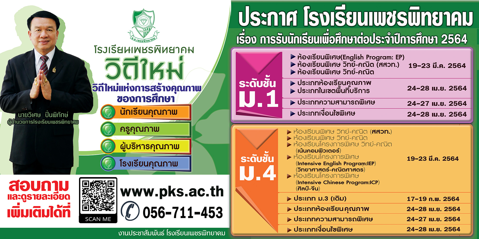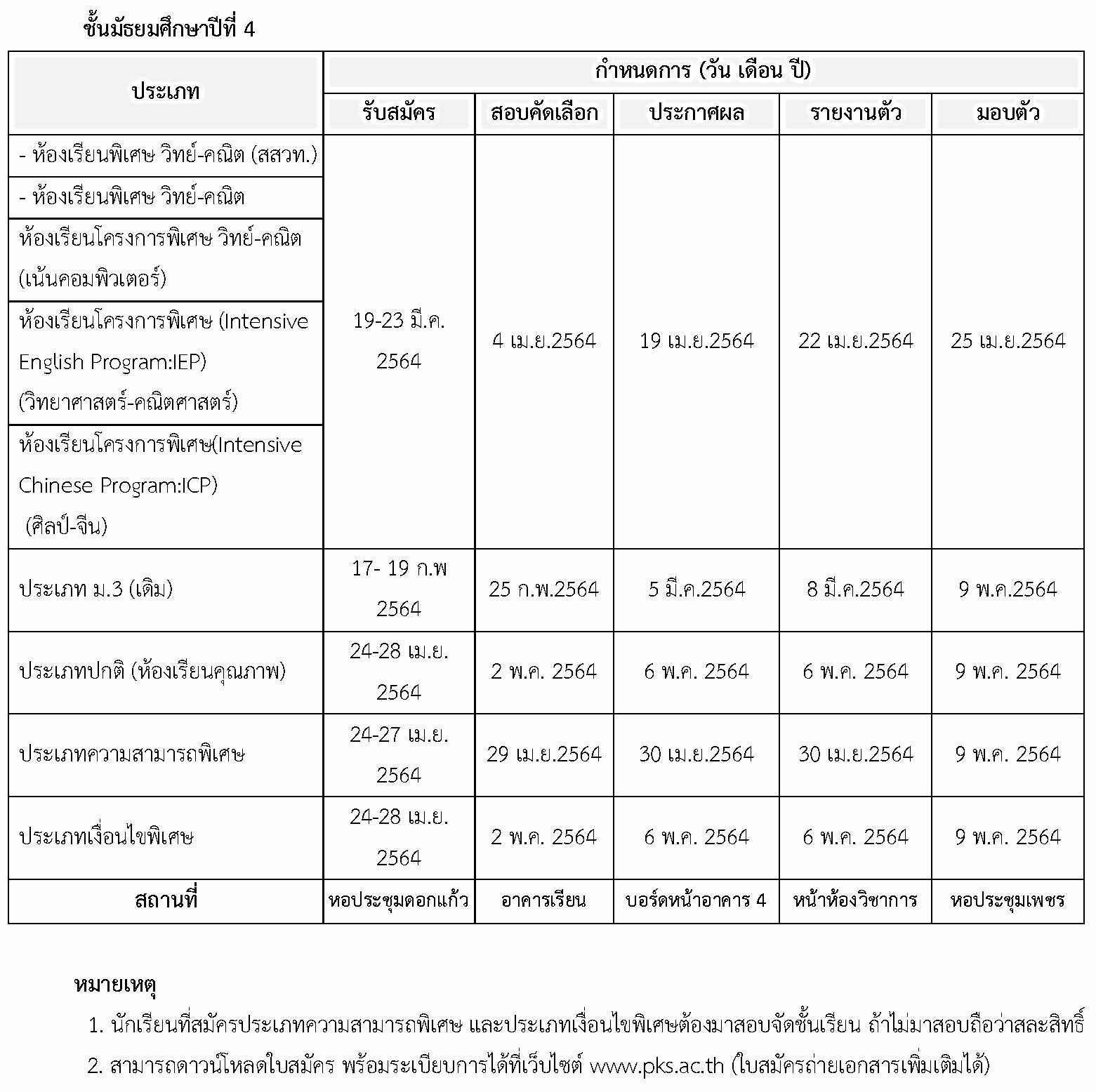 ปฏิทินการรับนักเรียนเพื่อศึกษาต่อชั้นมัธยมศึกษาปีที่ 1 และ ชั้นมัธยมศึกษาปีที่ 4 โรงเรียนเพชรพิทยาคม ปีการศึกษา 2564