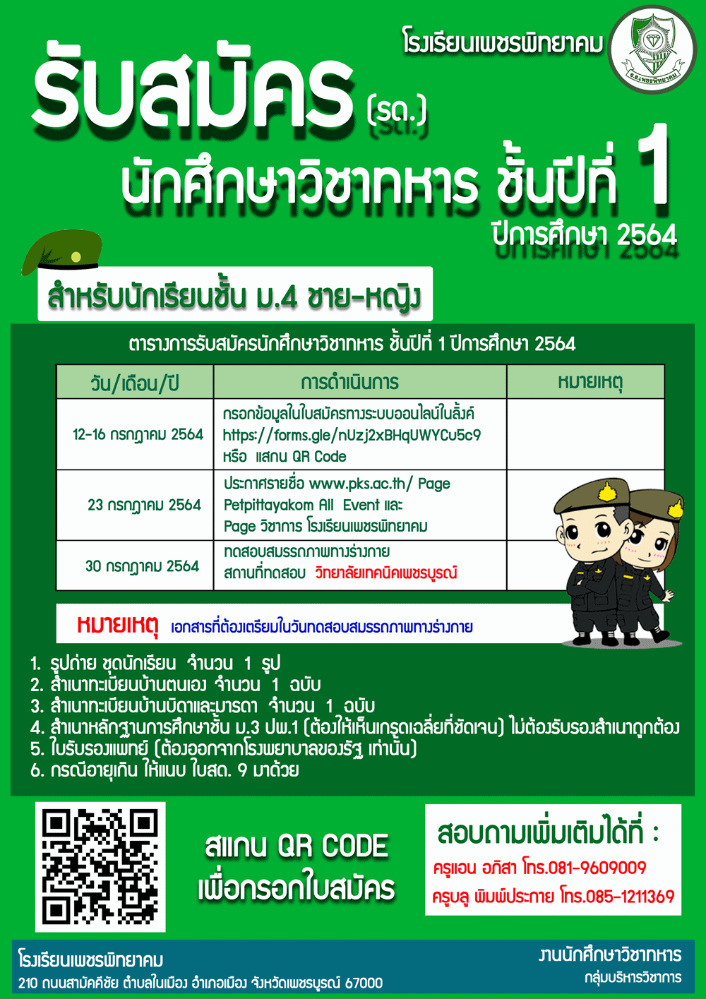 โรงเรียนเพชรพิทยาคม รับสมัคร(รด.) นักศึกษาวิชาทหาร ชั้นปีที่ 1 ปีการศึกษา 2564