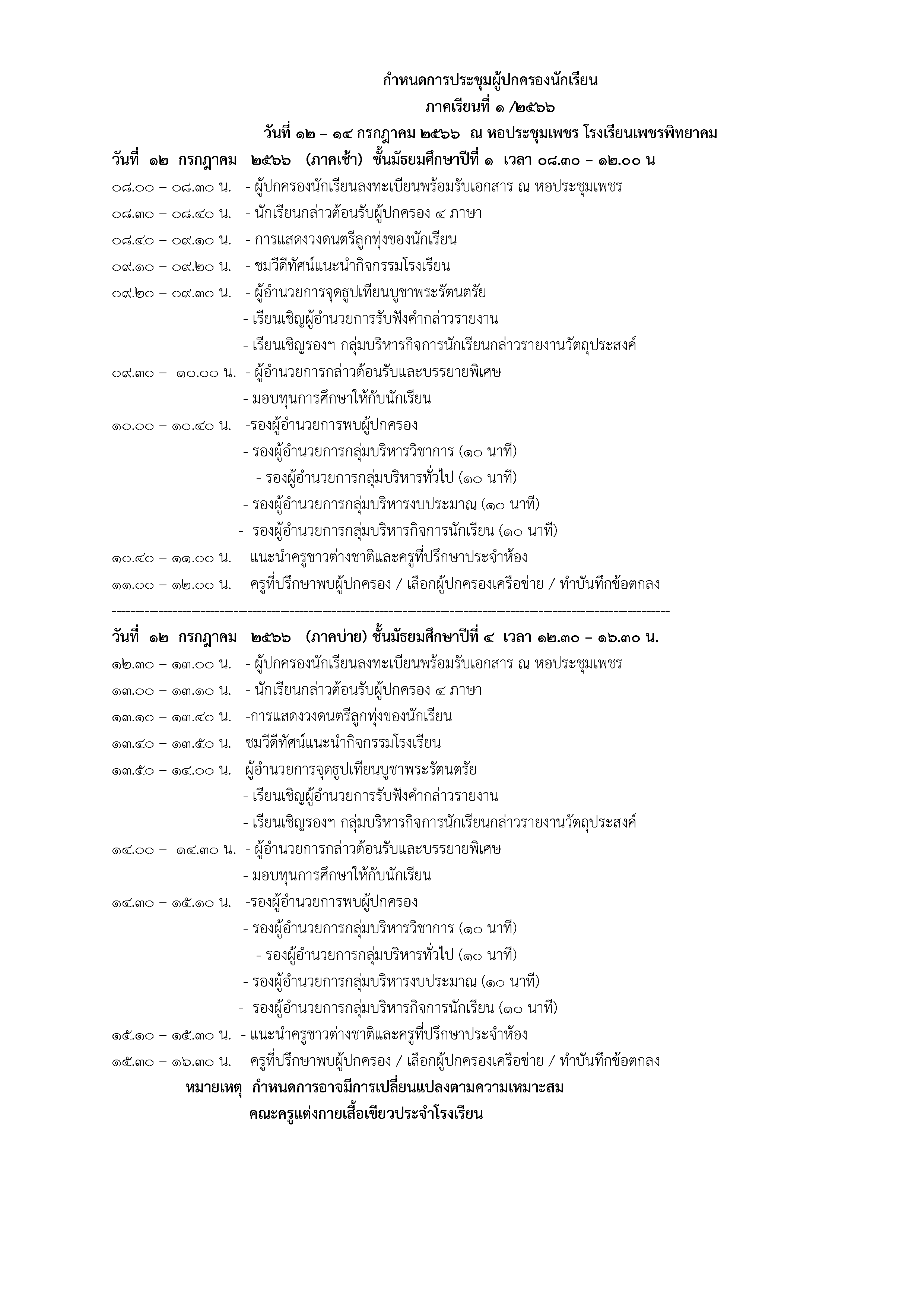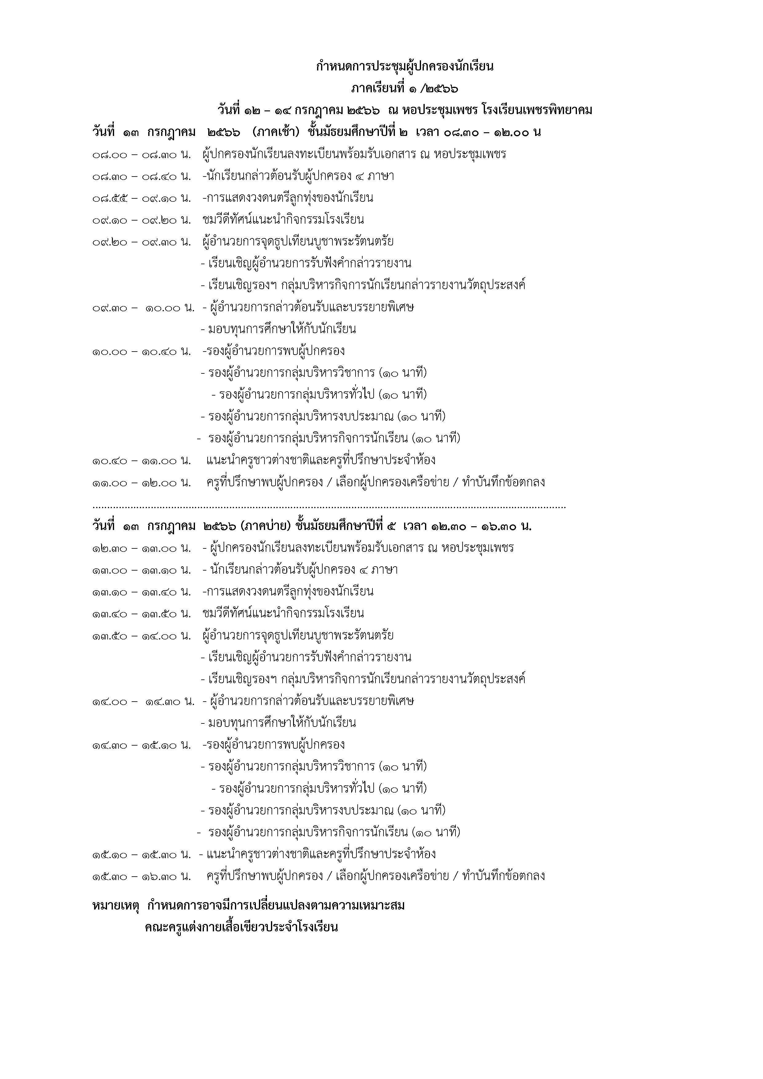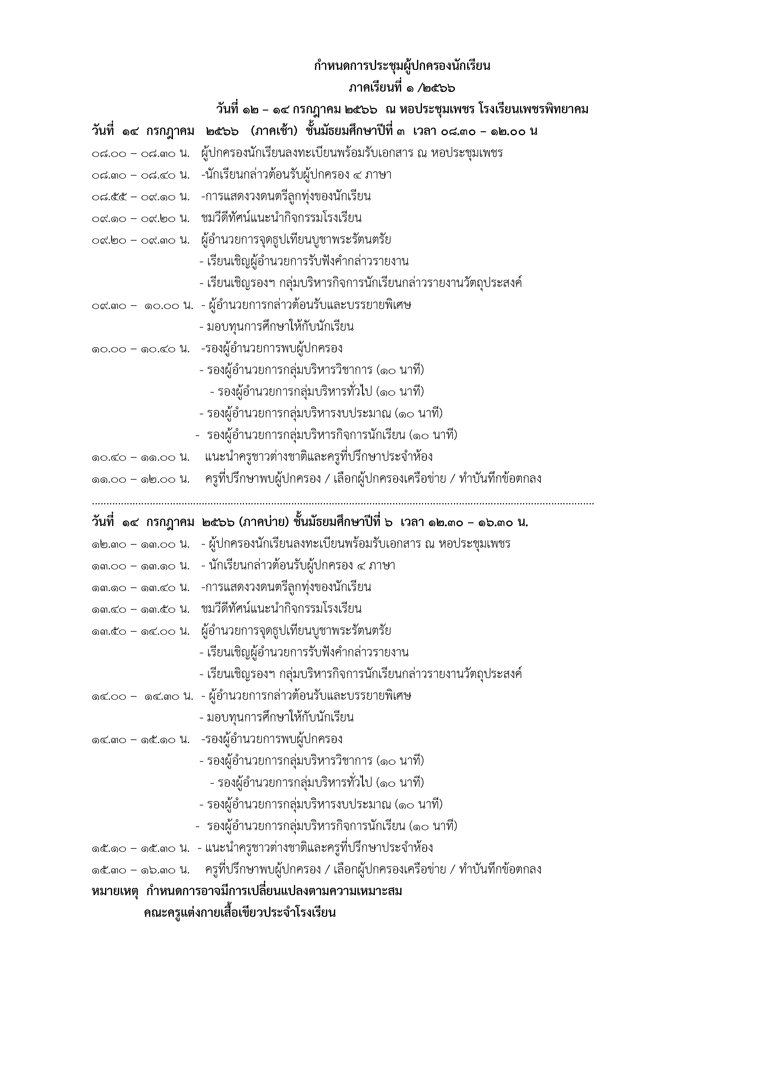 กำหนดการประชุมผู้ปกครองนักเรียน ภาคเรียนที่ 1/2566 ระหว่างวันที่ 12 - 14 กรกฎาคม 2566 ณ หอประชุมเพชร โรงเรียนเพชรพิทยาคม