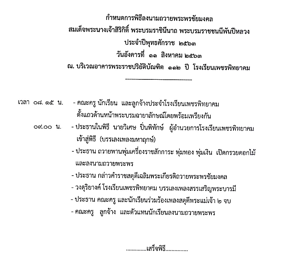 ด้วยโรงเรียนเพชรพิทยาคม ได้กำหนดให้วันอังคารที่ 11 สิงหาคม 2563 เป็นวันประกอบพิธีลงนามถวายพระพรชัยมงคล สมเด็จพระนางเจ้าสิริกิติ์ พระบรมราชินีนาถ พระบรมราชชนนีพันปีหลวง ประจำปี 2563 ตั้งแต่เวลา 08.00 - 09.20 น. ณ บริเวณอาคารพระราชปริยัติบัณฑิต โรงเรียนเพชรพิทยาคม