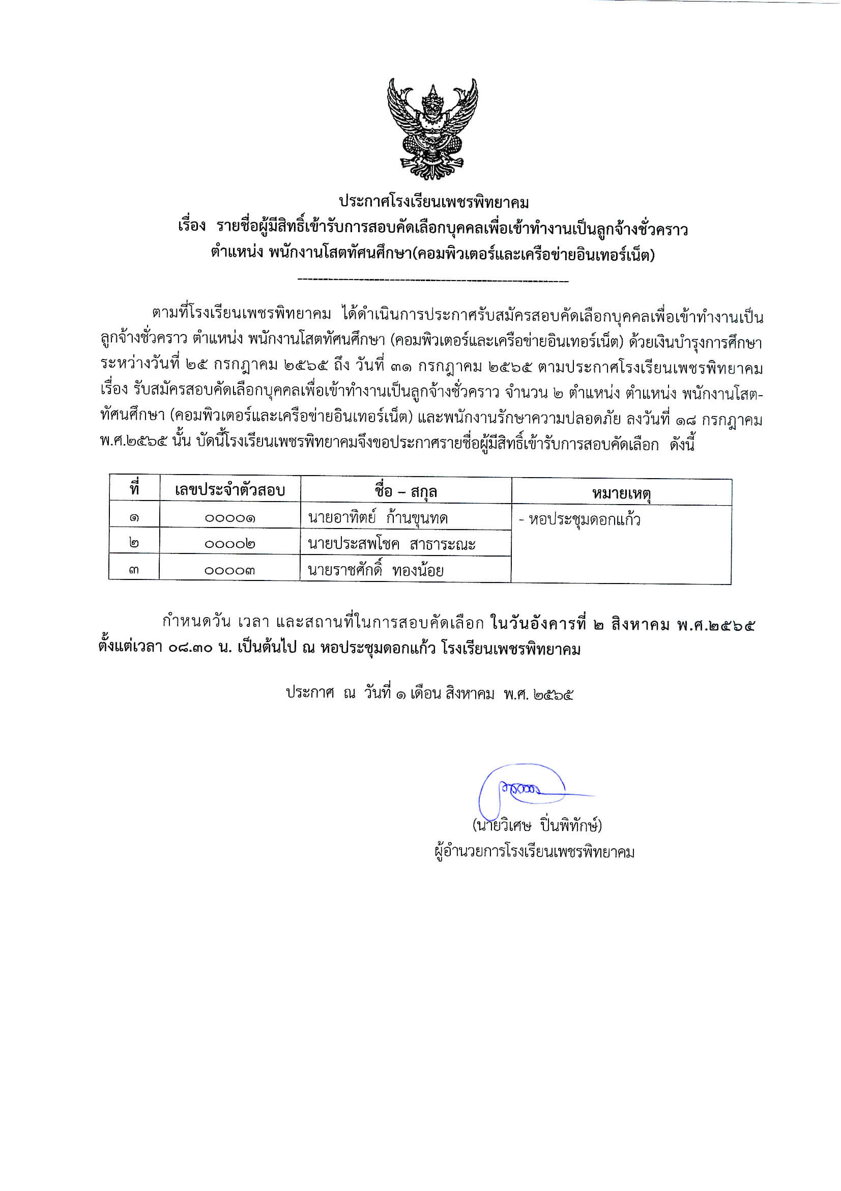 ประกาศโรงเรียนเพชรพิทยาคม เรื่อง รายชื่อผู้มีสิทธิ์เข้ารับการสอบคัดเลือกบุคคลเพื่อเข้าทำงานเป็นลูกจ้างชั่วคราว ตำแหน่ง พนักงานโสตทัศนศึกษา(คอมพิวเตอร์และเครือข่ายอินเทอร์เน็ต)
